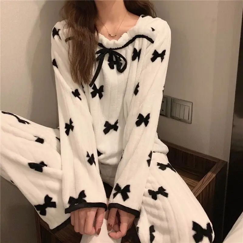 Square Collar Long Sleeve Sleepwear Women Pajamas Set Winter Sleepwear Fleece Velvet Home Suit Korean Pajama Warm Night Wear