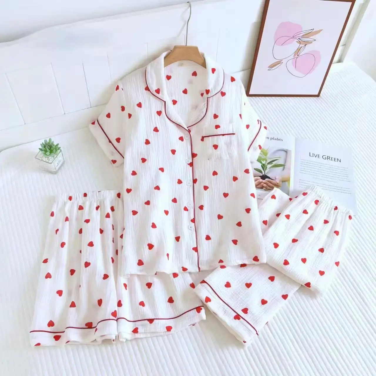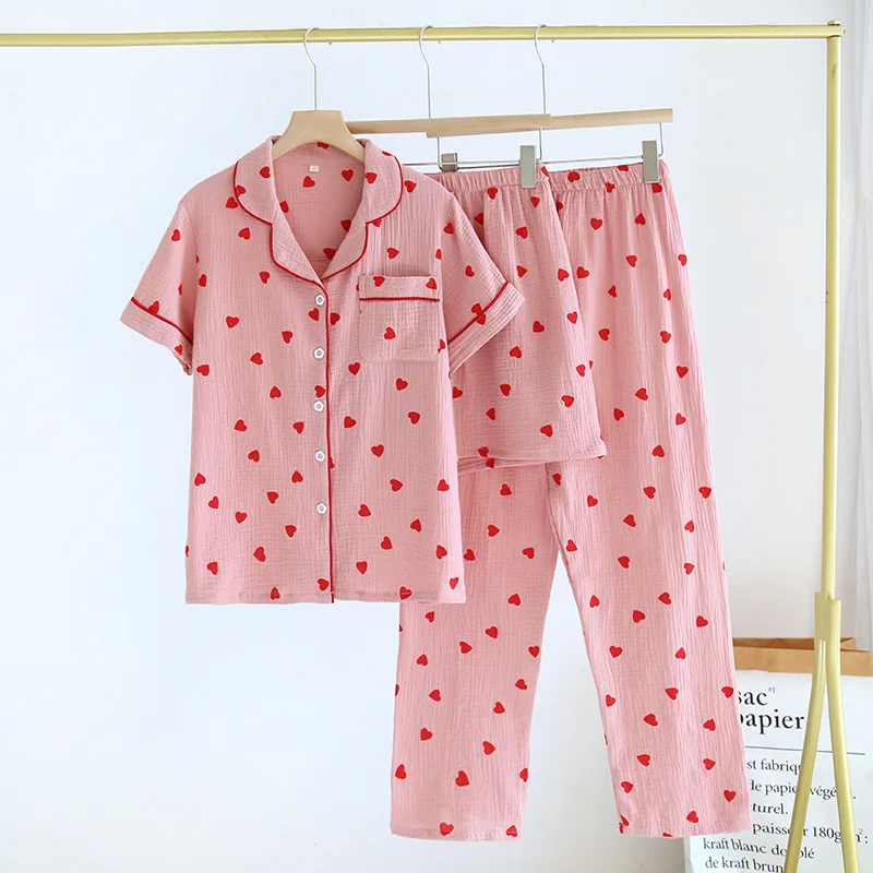 Cotton Womens Pajamas 2 Piece Pajama Set Heart Print Long Sleeves Button Down Lapel Shirt Long Pants Matching Set Loungewear OEM