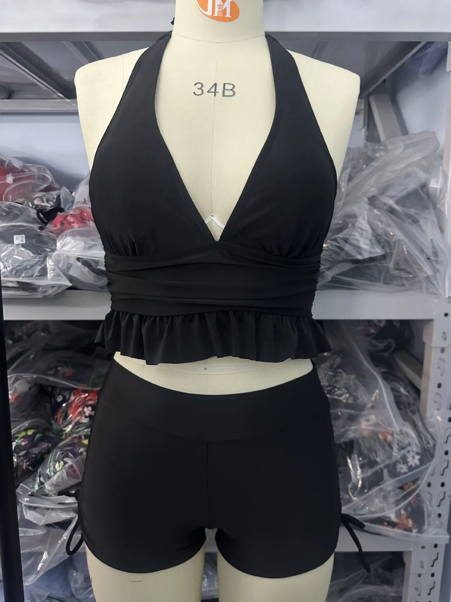 Custom Logo Swimwear V-neck Camisole Ruffled Women Bikini 2-piece Swimsuit High Waist Flat Angle Pants Hanging Neck Tie Swimwear