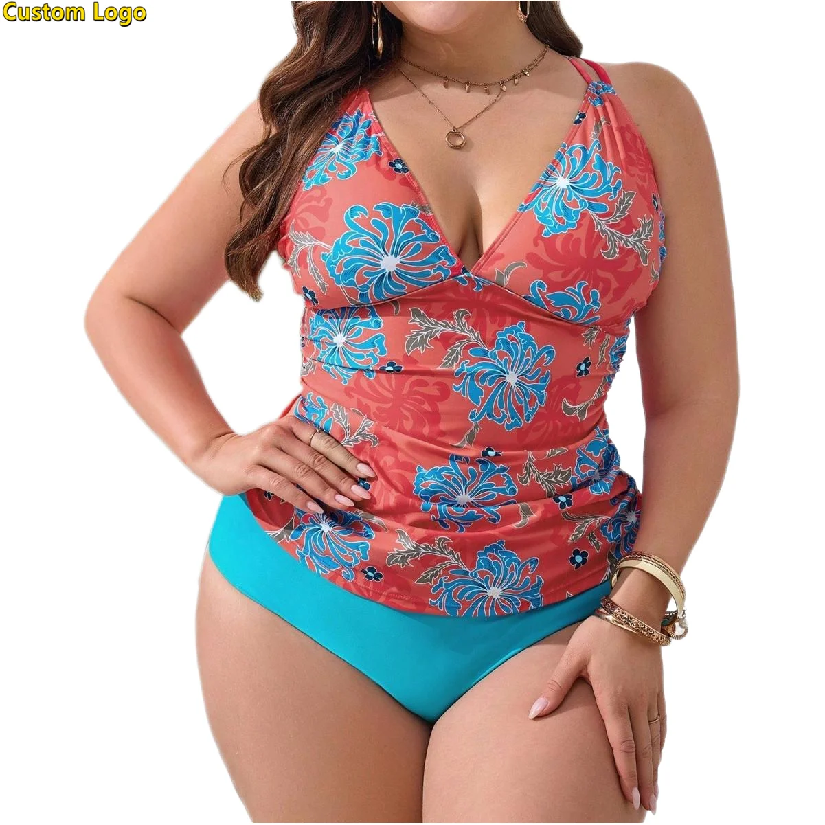 Custom Swimwear Floral Women's Plus Size Tankini Set Quick Drying Breathable Swimsuit with Cover Tummy Fashionable Beachwear