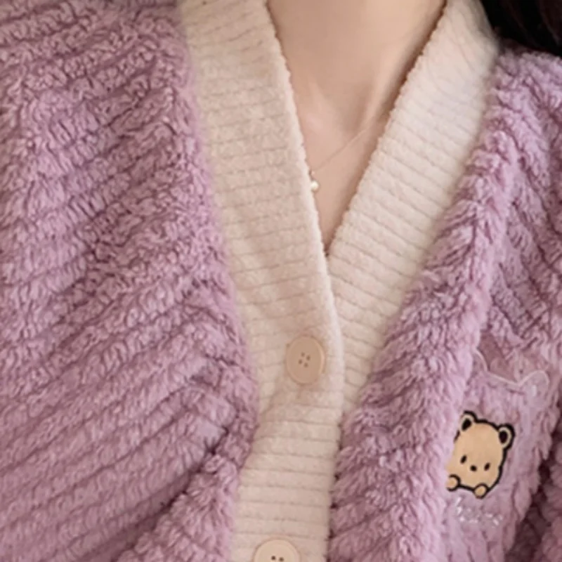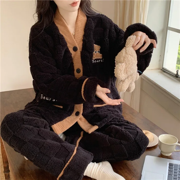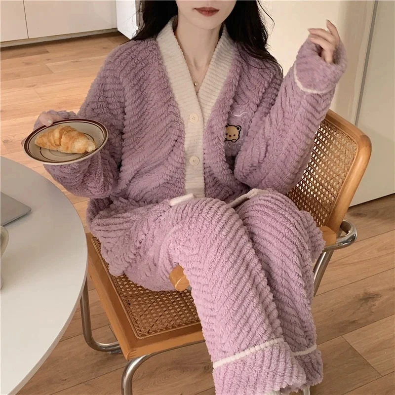Women's Coral Fleece Pajamas Flannel Sleepwear Soft Pajamas Set V-neck Thicken Warm Loungewear 2 Piece Pjs Set