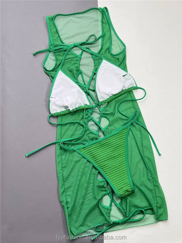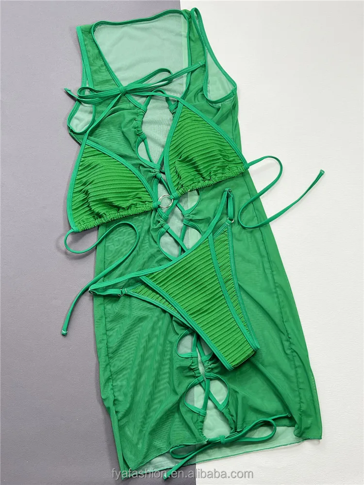 Lace Sun Protection 3 Pcs Swimsuit Set Sexy Thong Knot Bikini