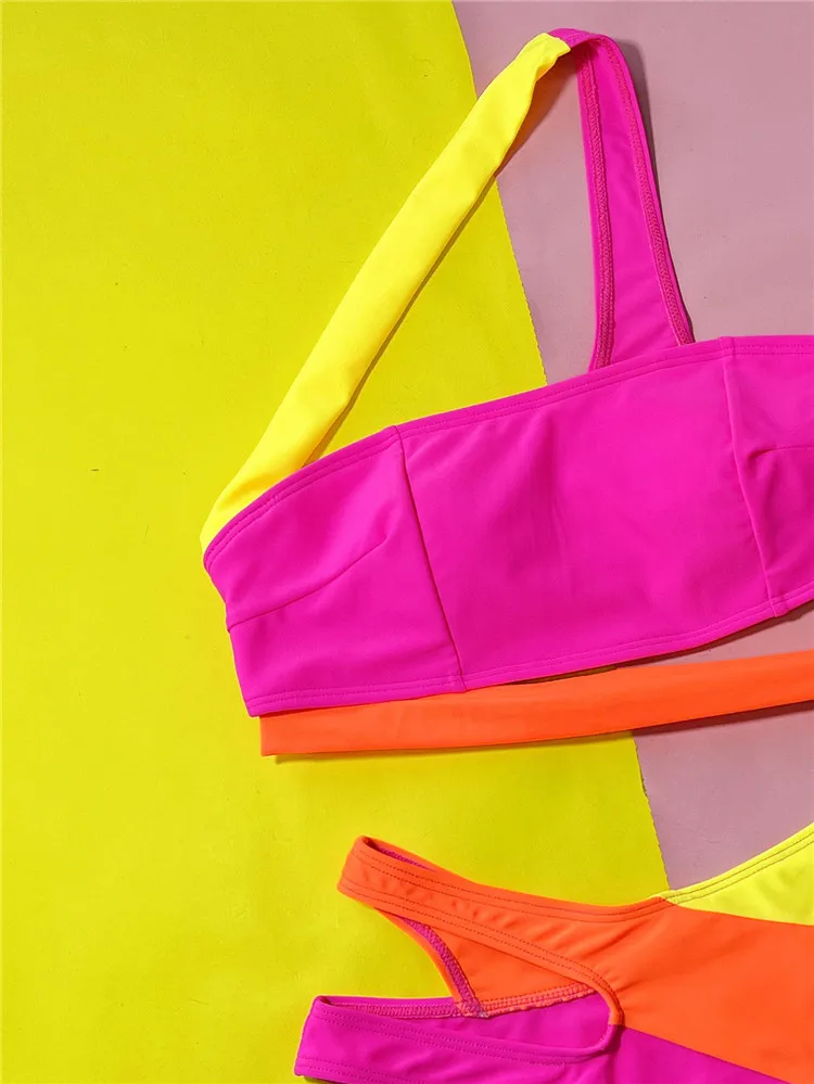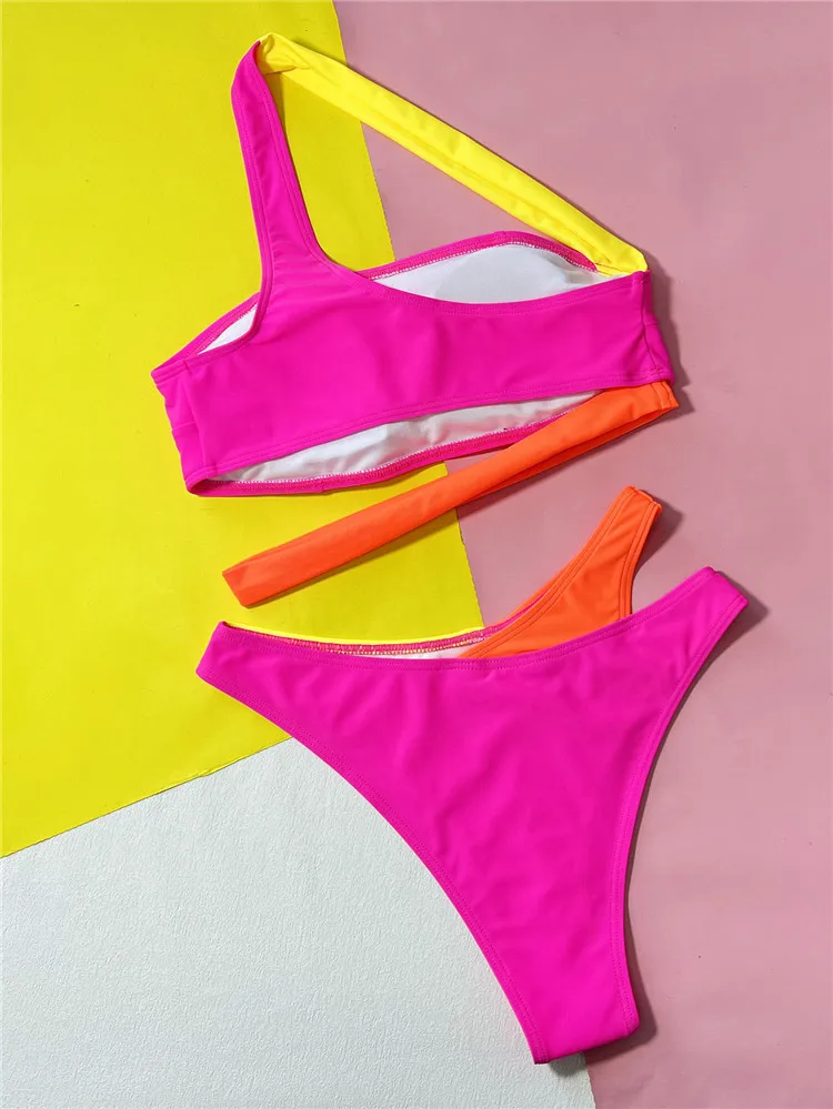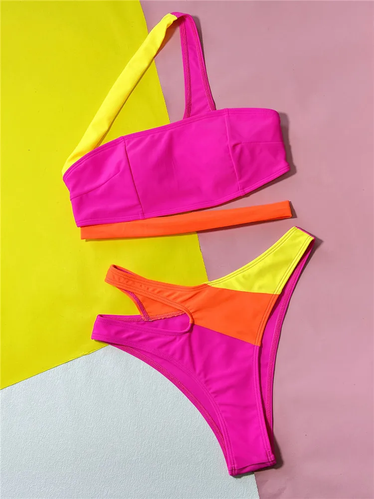 2026 One Shoulder Sexi High Cut Bandeau Patchwork Pink Bikinis Woman Swimwear