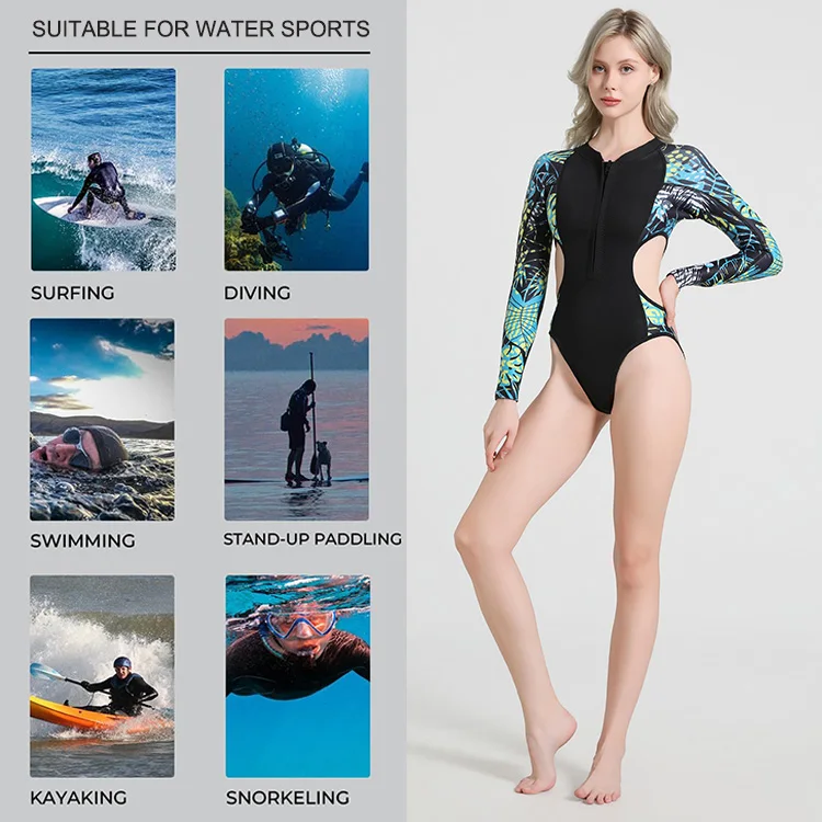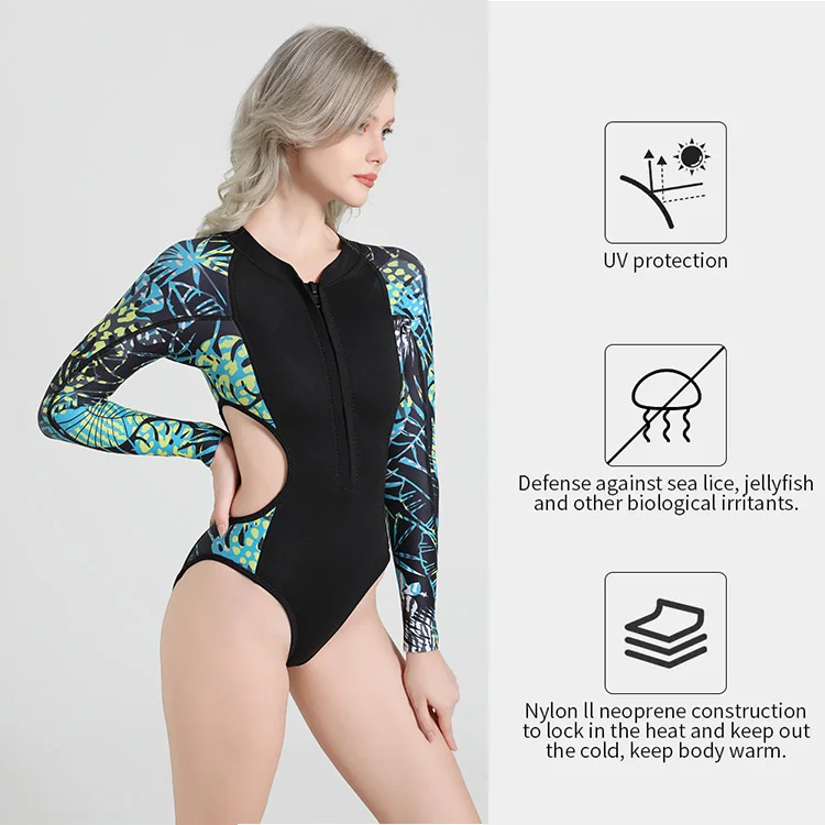 Stretchy Digital Print Wetsuit for Women 1.5/2mm Lightweight Neoprene Long Sleeve Cutout Dive Suit with Chest Zip UV Protection