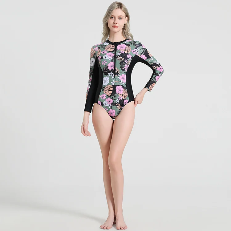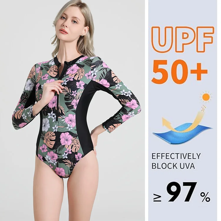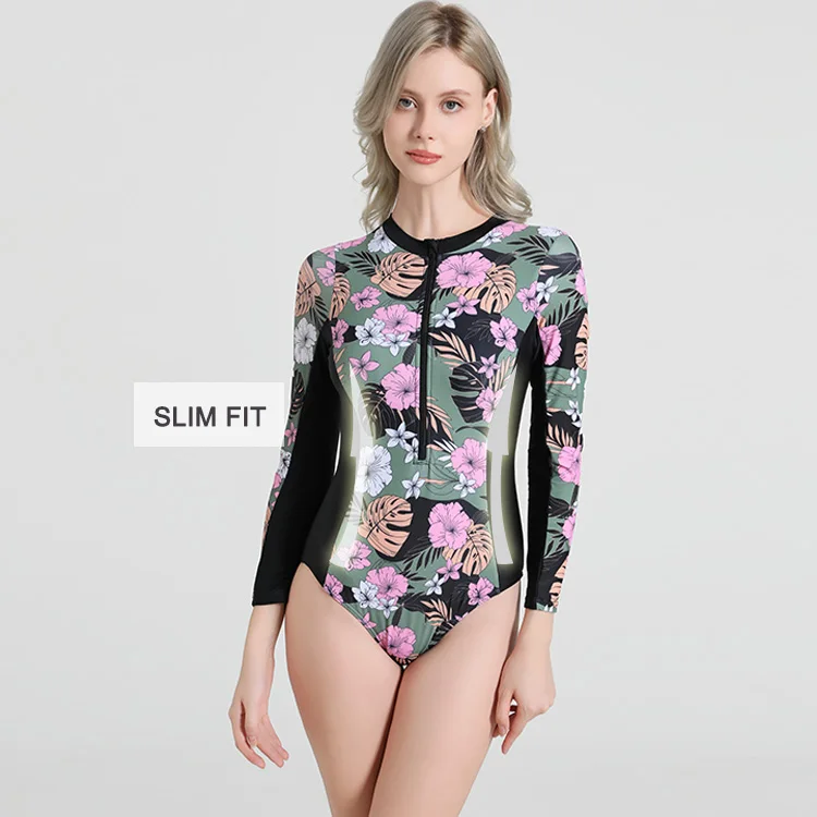 Colorful Printed Long Sleeve One Piece Swimsuit for Women Triangle Cut Polyester Rash Guard with Front Zipper Quick Dry UPF50+