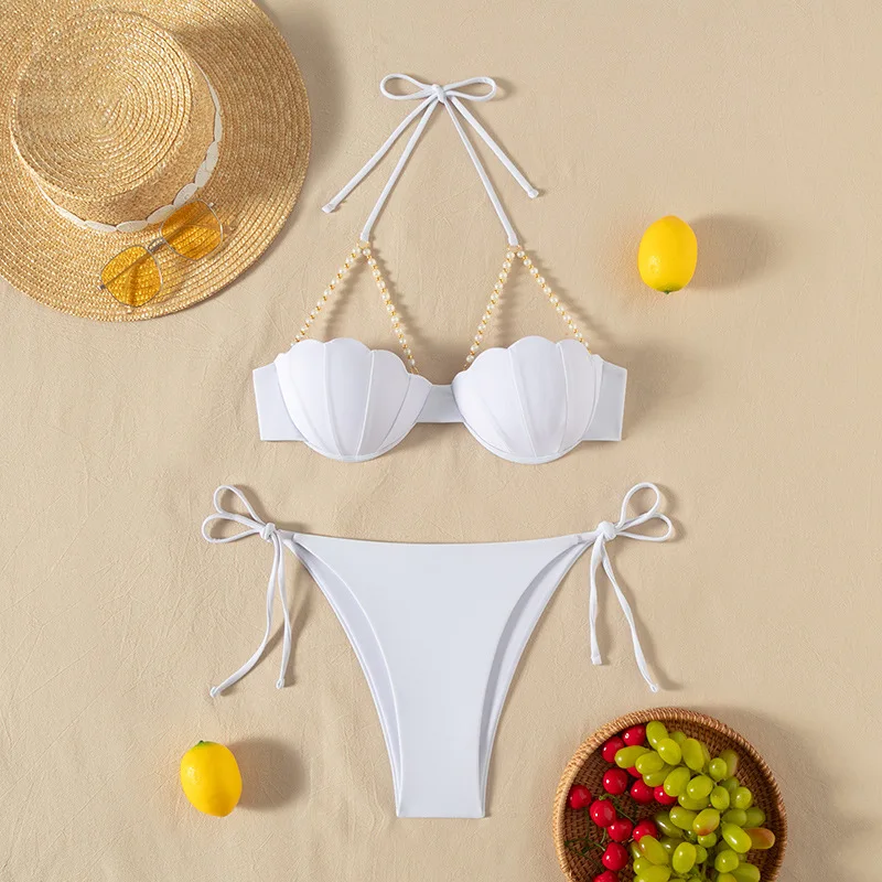 STOCK 3Colors Underwire Swimwear Women Pearls Brazilian Bikini Shell Bra Swimsuit S-XL