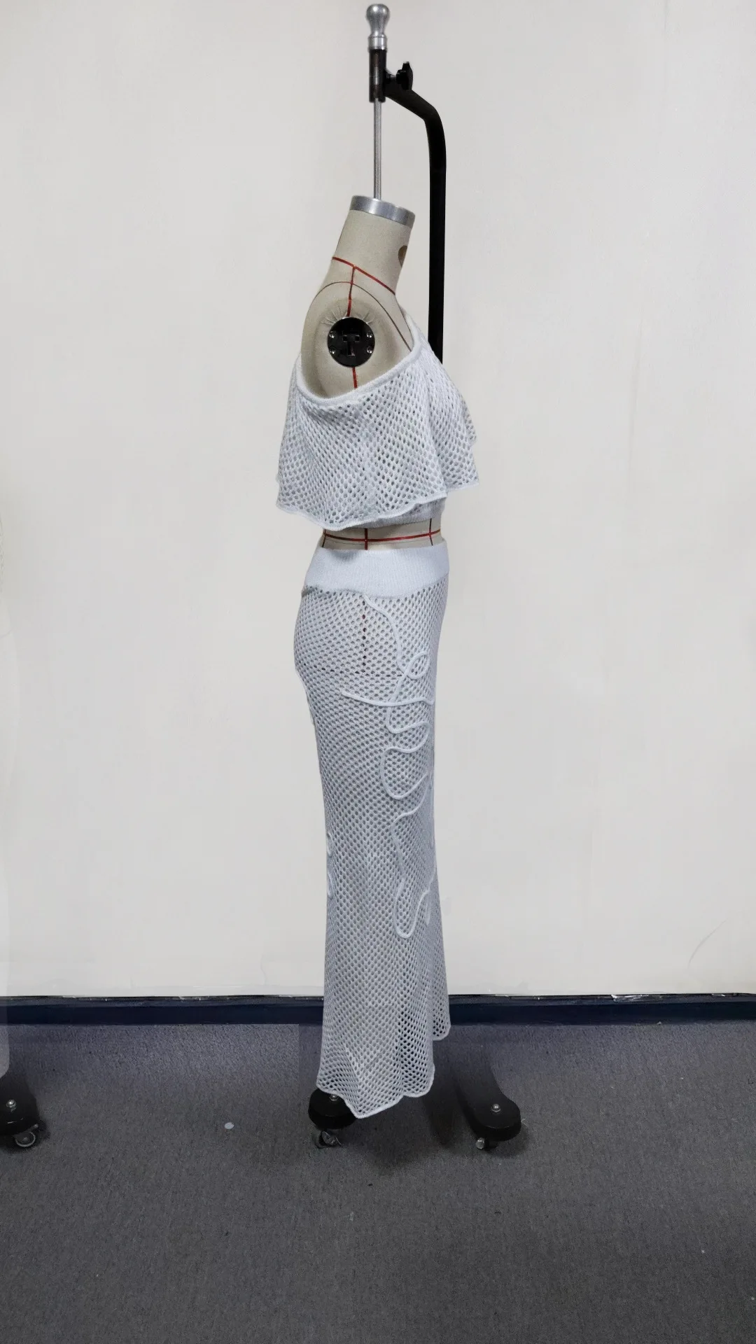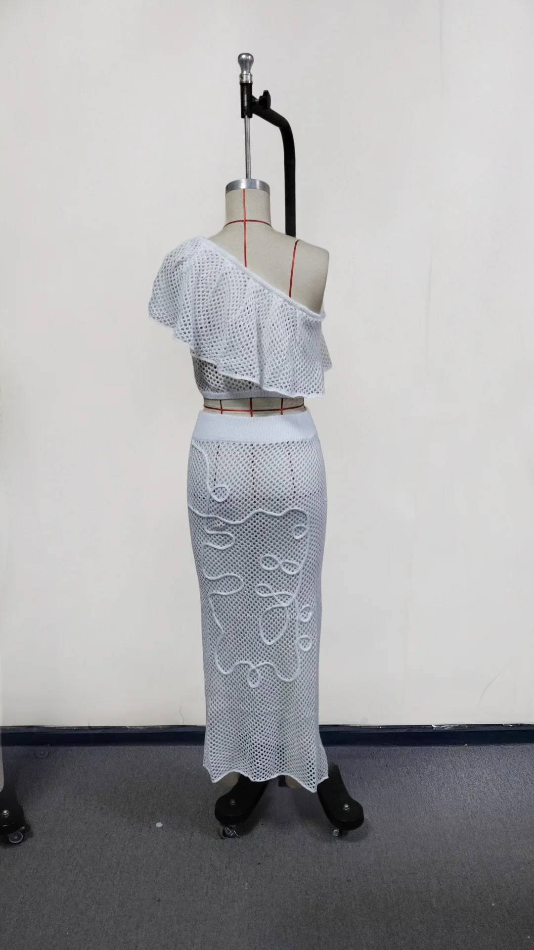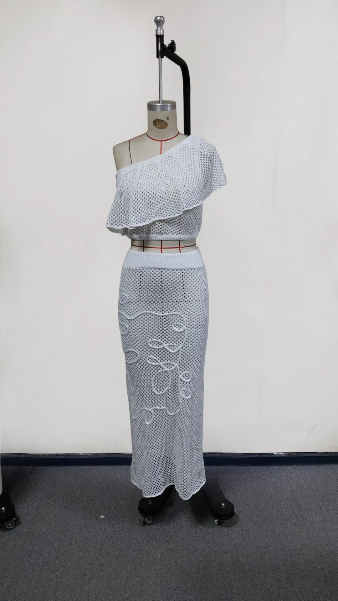 STOCK Two Colors Knitted Women Two Pieces Set One Shoulder Ruffle Bandeau Top and Skirt Set Hollow Out Cover Ups Beachwear S-L