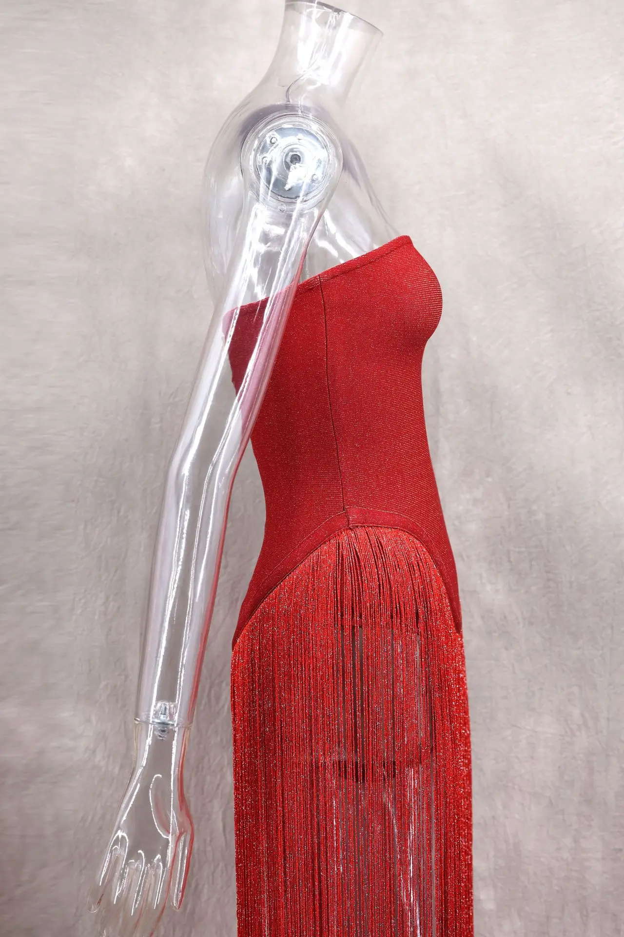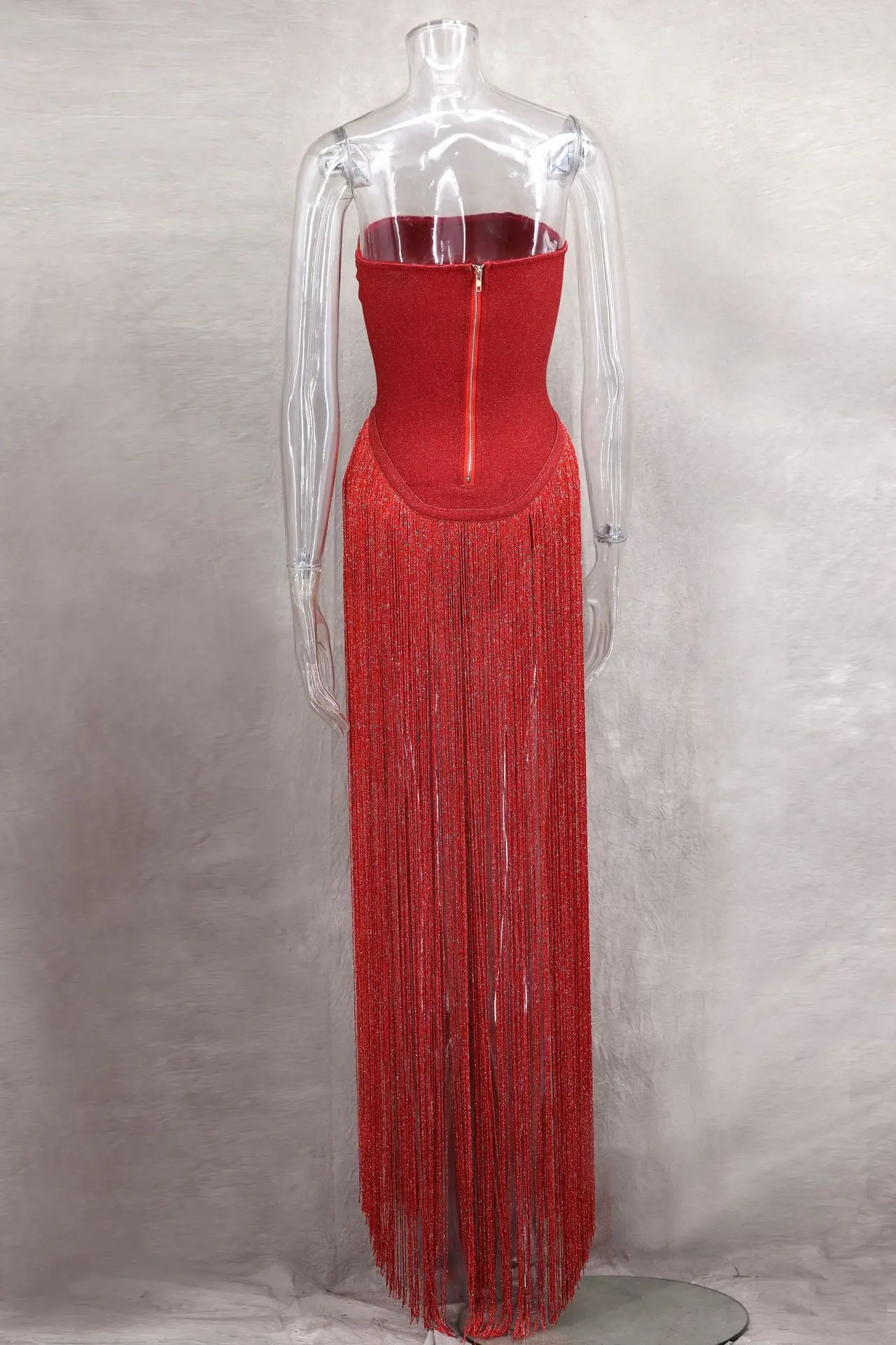 STOCK Strapless Zipper Back Women Dress Tassel Details Maxi Dress Party Evening Dress S-L