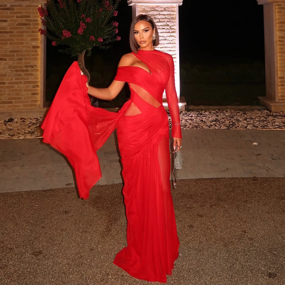 STOCK Cut Out Floor Length Dress Women Sheer Mesh Insert Maxi Dress Long Gown S-L