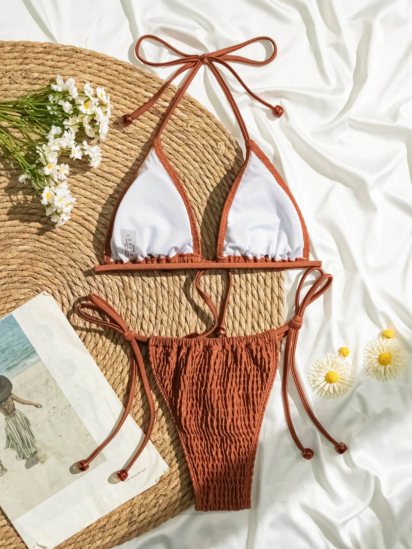NEW STOCK Ties Details Beads Ending Basic Swimwear Women Smocked Brazilian Bikini Swimsuit S-L