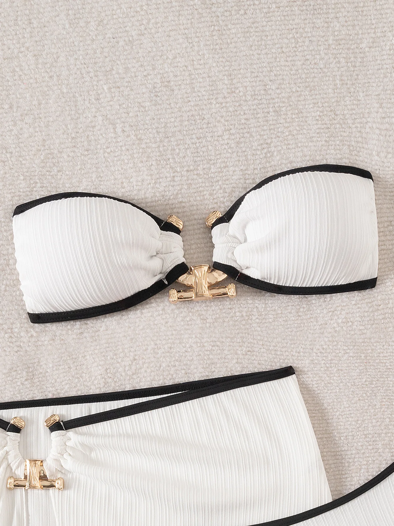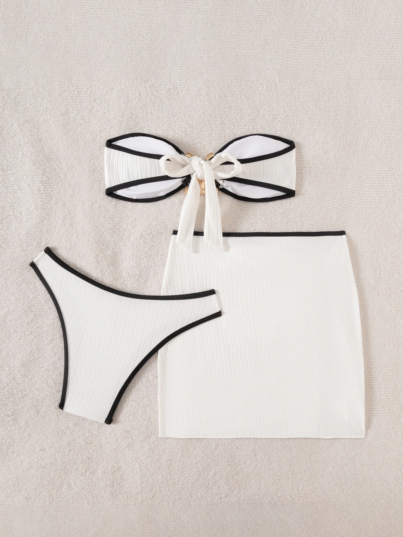 STOCK Knitted 3Pieces Swimwear Women Strapless Bandeau Top Brazilian Bikini and Skirt Set Beach CoverUp S-L