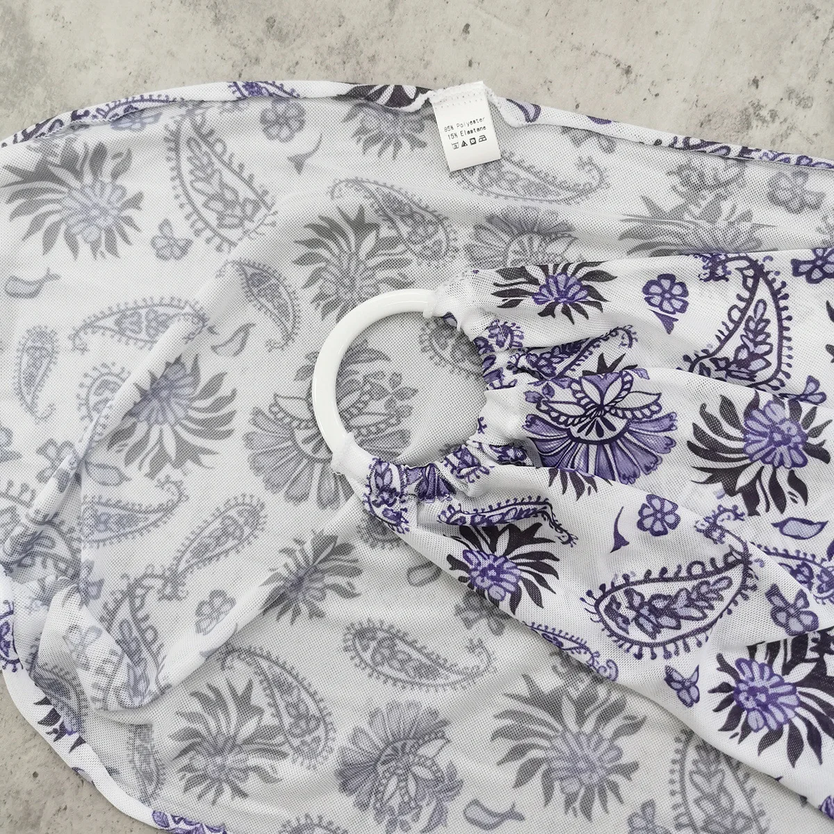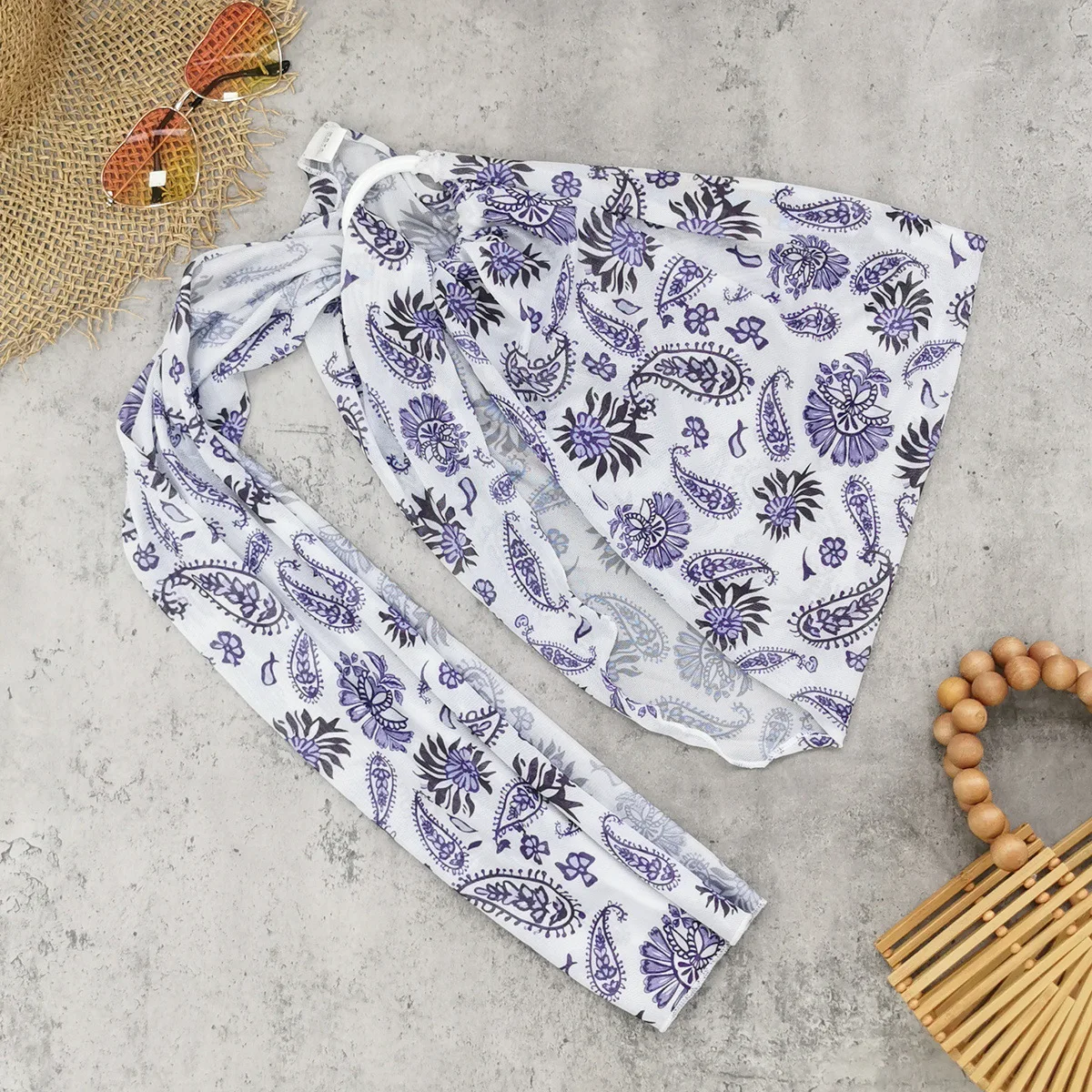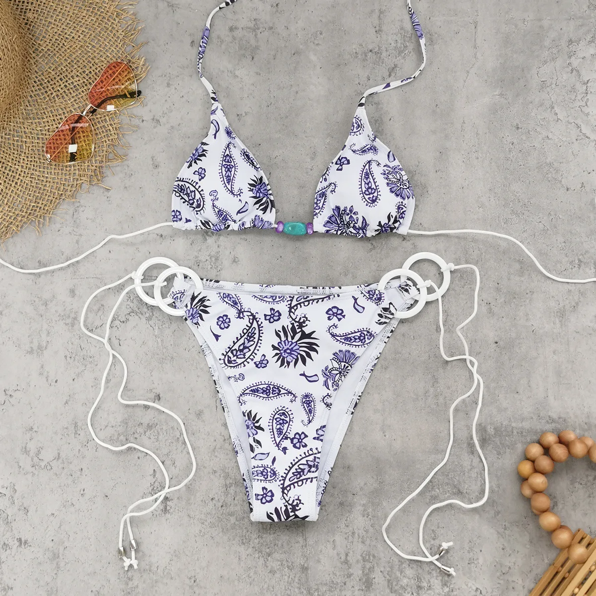 STOCK Print Women 3Pieces Swimwear Beads Triangle Top Bikini and Sarong Set Rings Mesh Beach CoverUp S-M