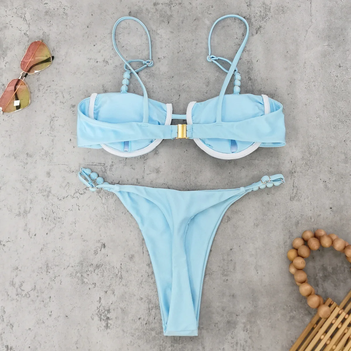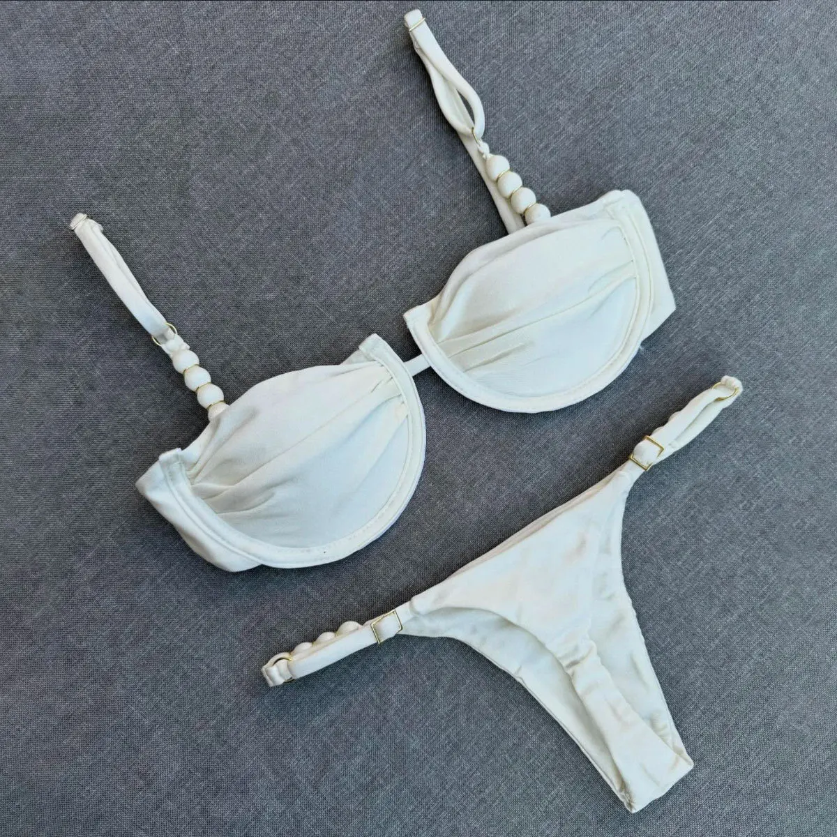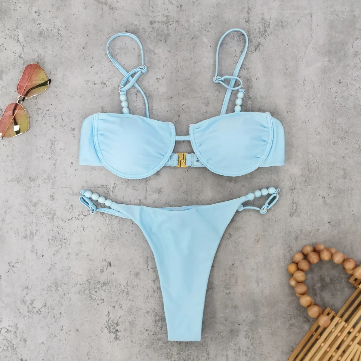 STOCK Two Colors Underwire Swimwear Women Thong Bikini Beads Swimsuit S-M
