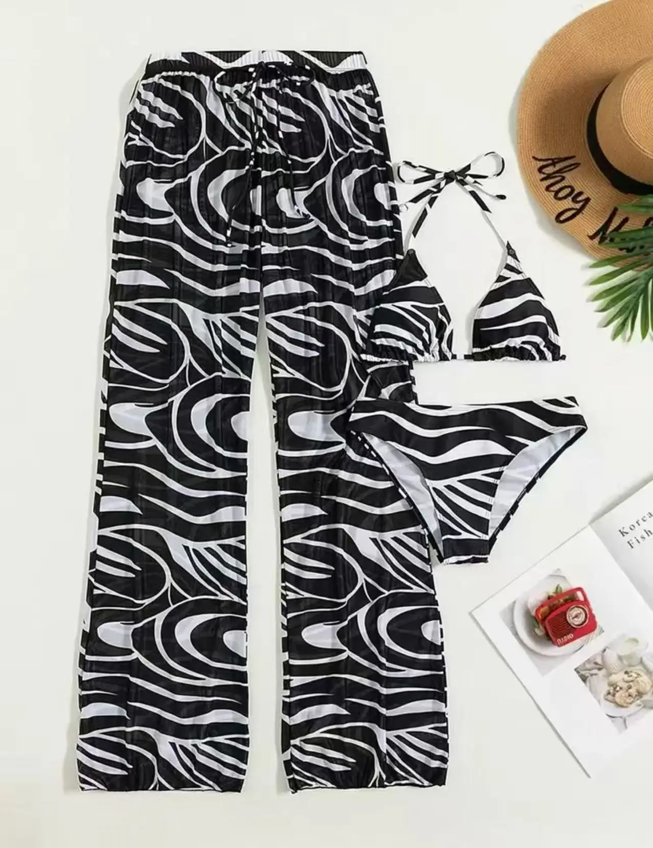 STOCK Print Women 3Pieces Swimwear Ties Details Brazilian Bikini and Skirt Set Shell Swimsuit Beach CoverUp S-XL