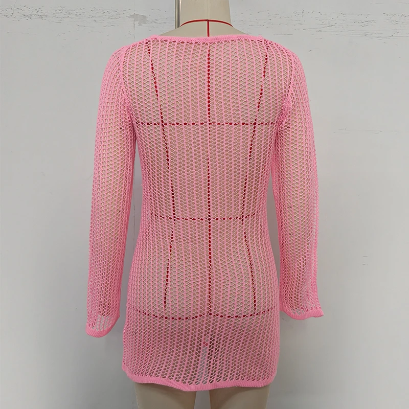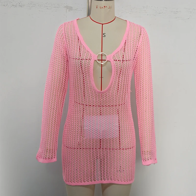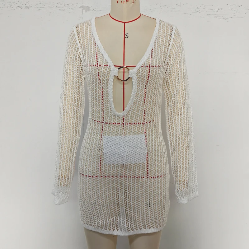 STOCK 3Colors Hollow Out Dress Women Long Sleeve Rings Mini Dress Swimsuit Sheer Cover Ups S-L