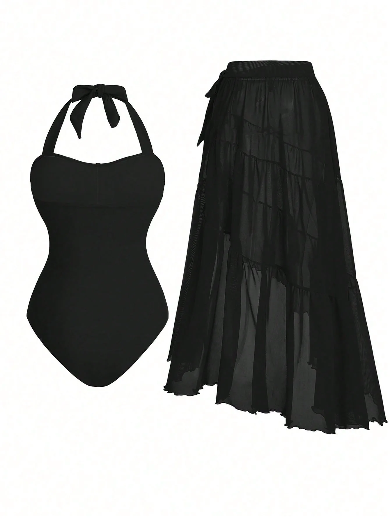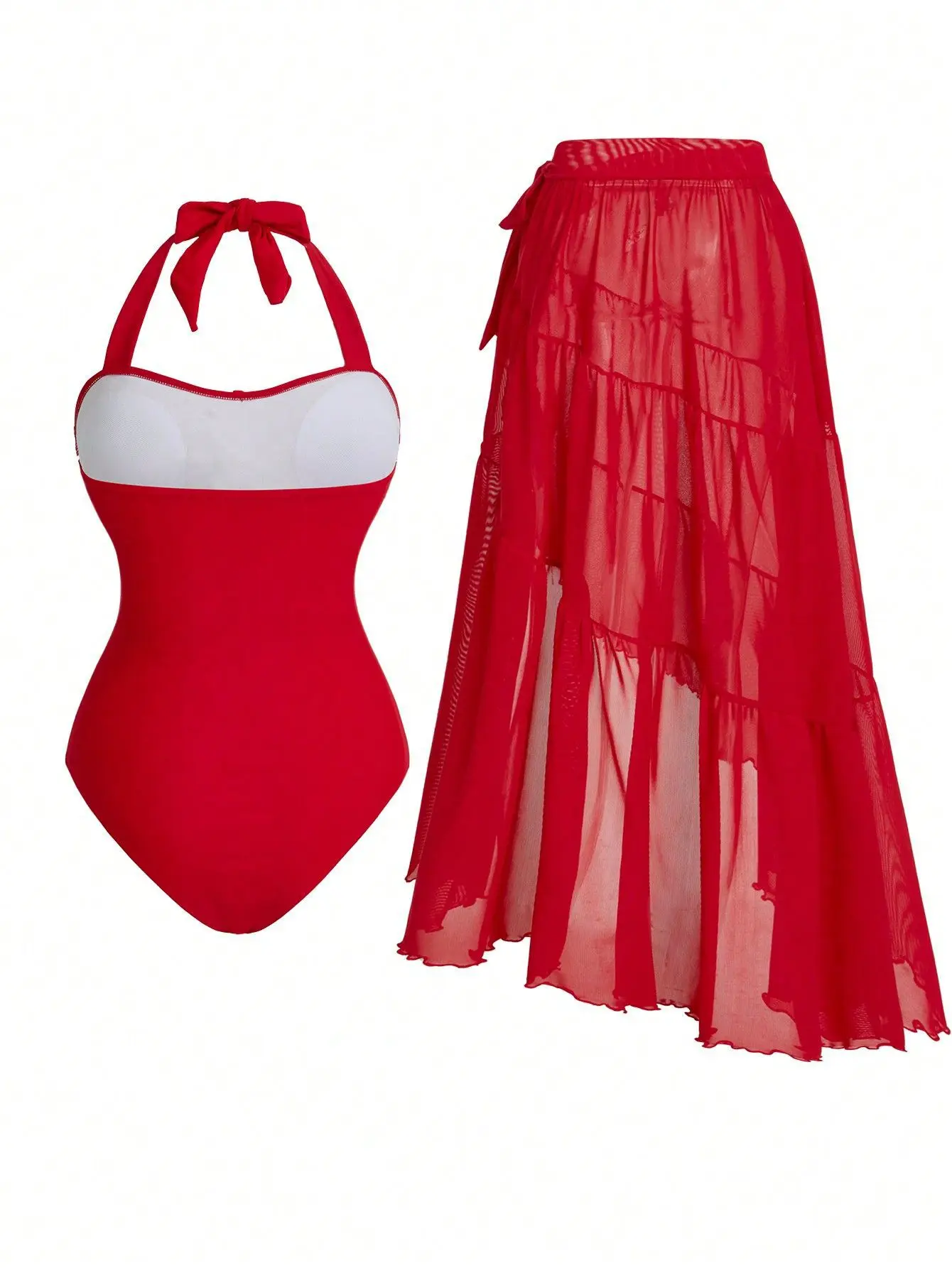 STOCK Two Colors Ties Neck Back Trendy Women Two Pieces Swimwear 3D Flower Swimsuit and Cover Ups Set S-XL