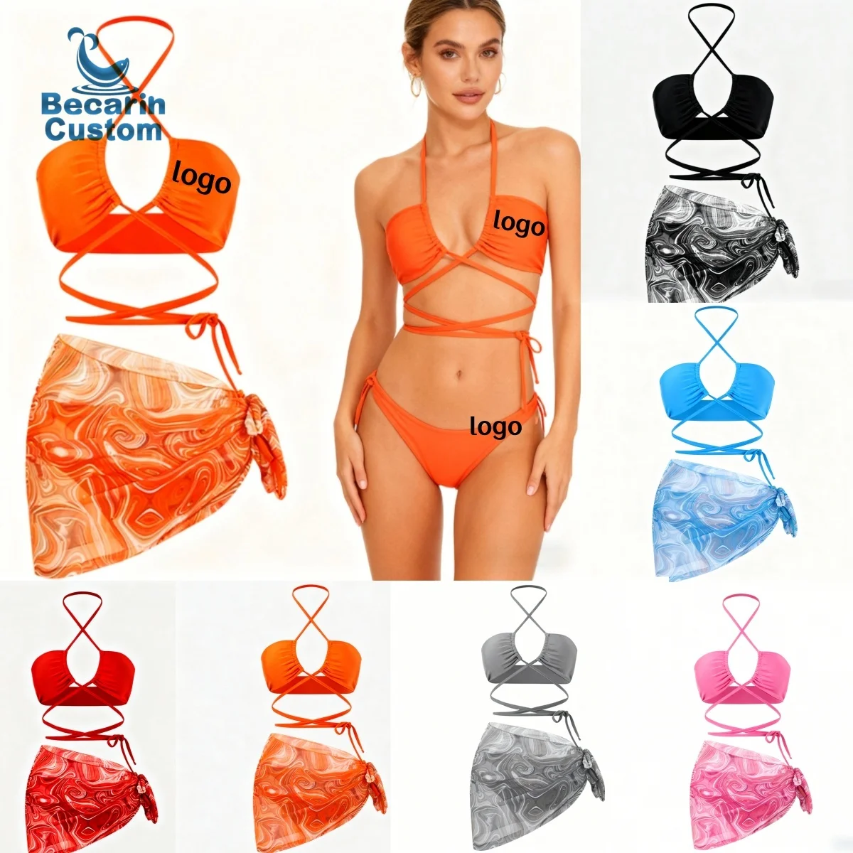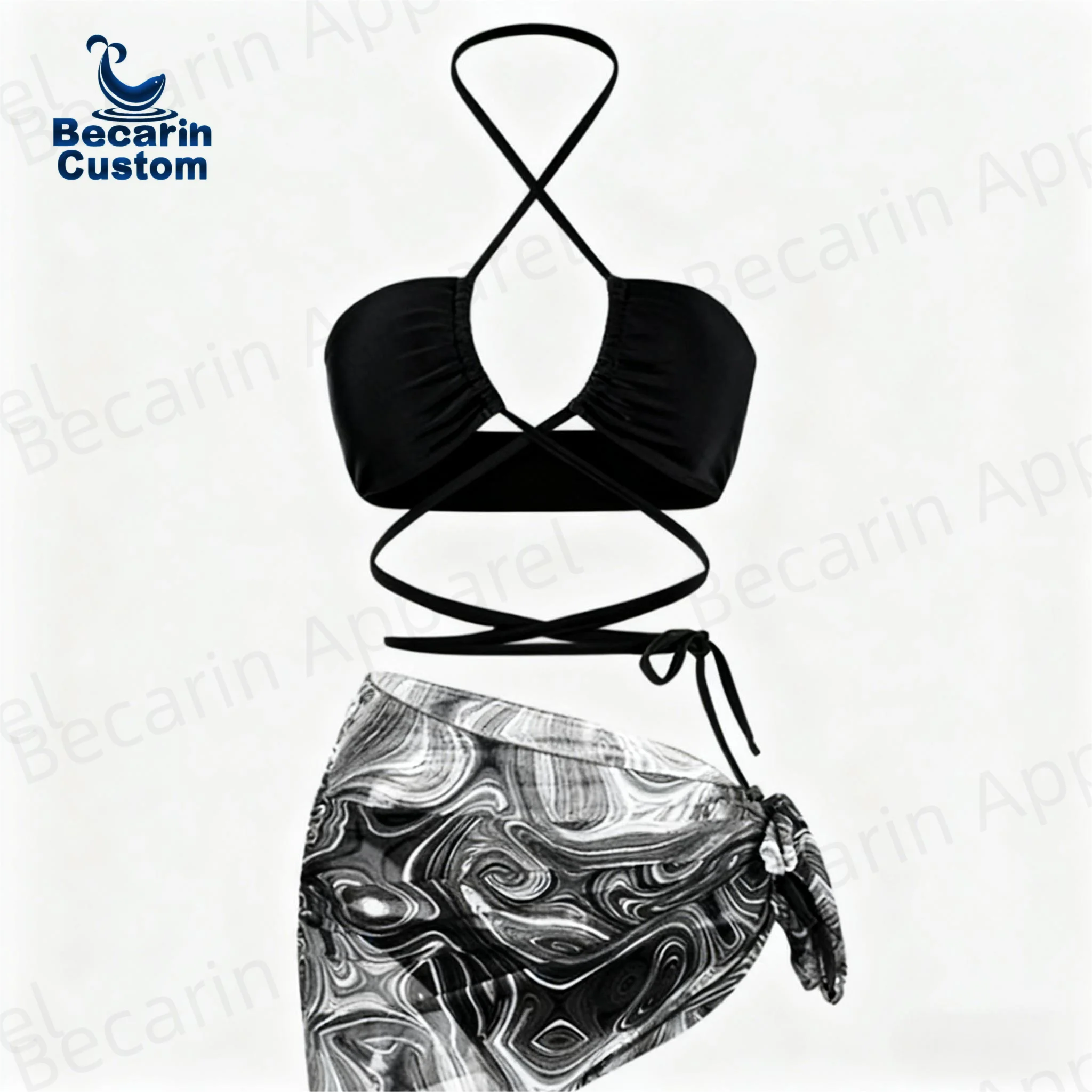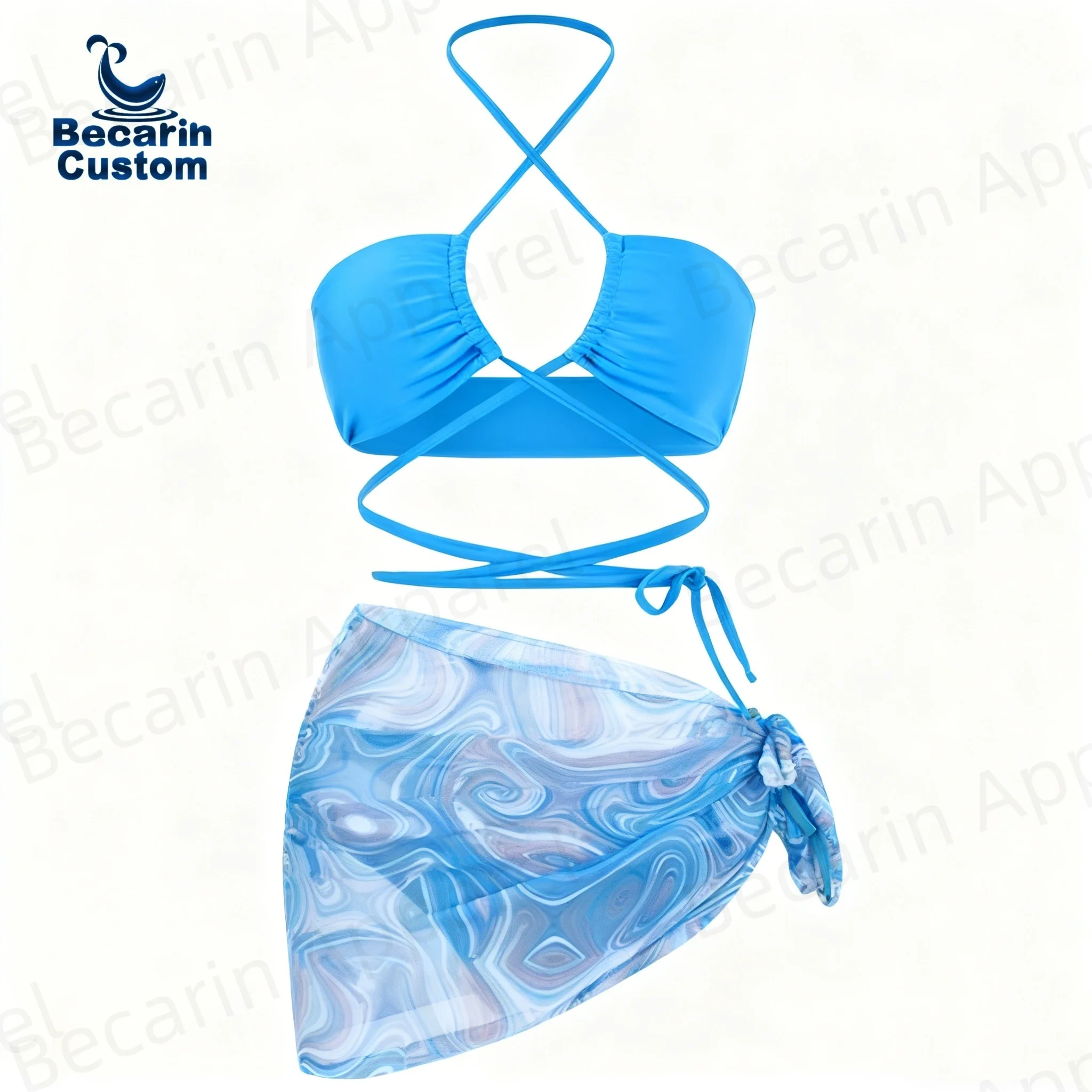 OEM Manufacturer Multi-Color Ruched Strapless Halter Bikini and Sarong Cove up 3 Piece Swimsuit Set Custom Logo Service