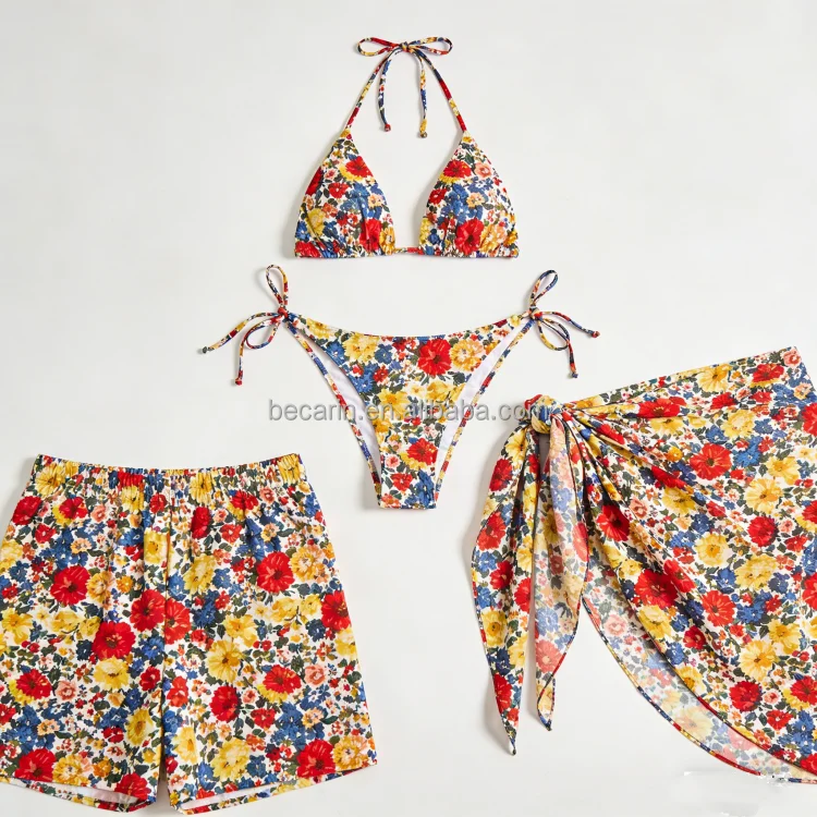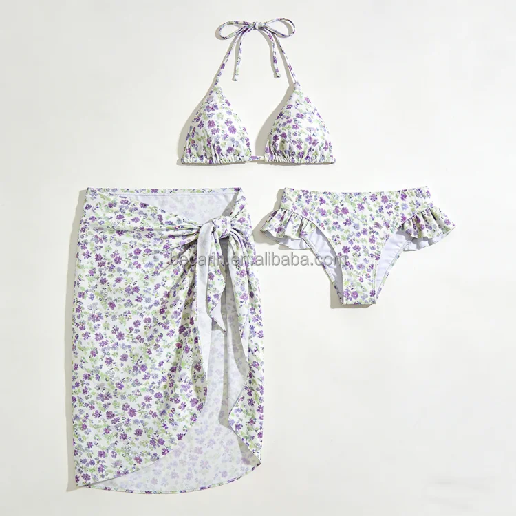 Hot Sale Custom Printed Triangle Bikini Quick Dry Three-Piece Swimwear Removable Padded Mesh Skirt Thongs Bottom Plus Waist