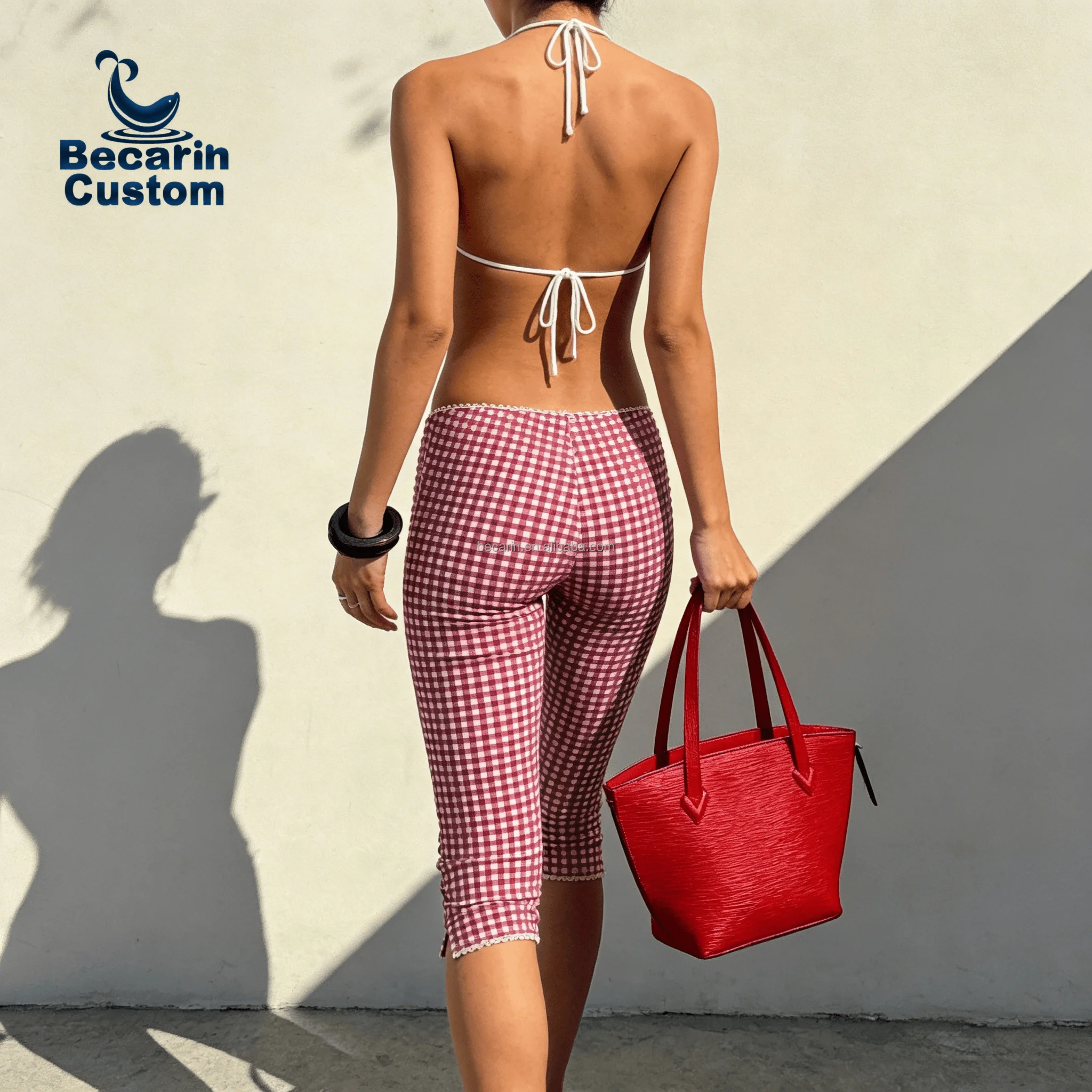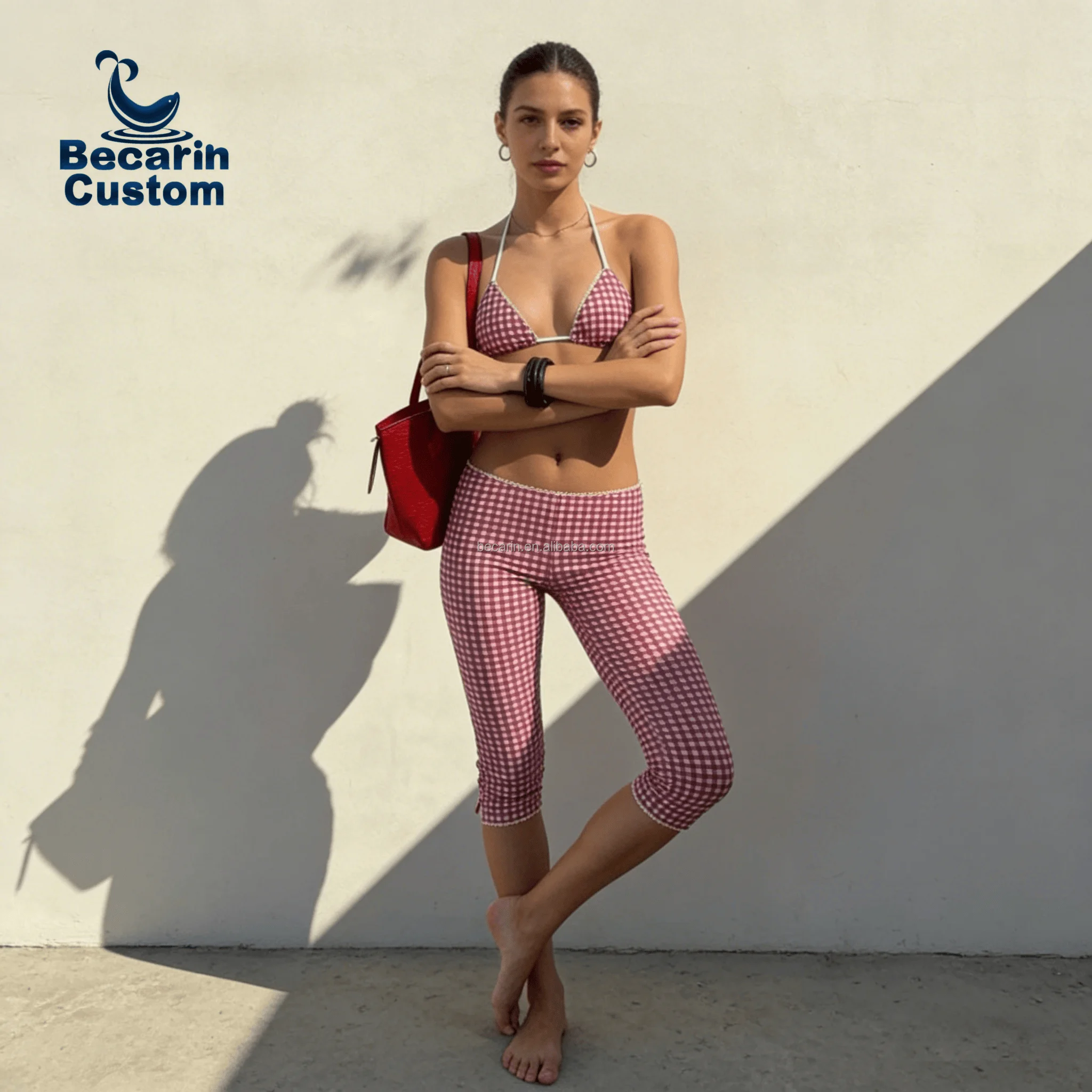 OEM Luxury Women's Micro Bikini Top and Nine-point Skinny Pants Custom Logo Fitness Swimwear Pattern 2-Piece Set Sexy Beachwear