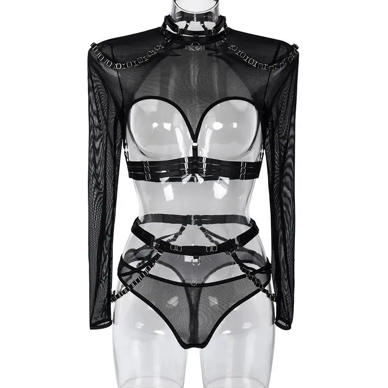 Hottest Women's Black Sexy Mesh Intimates Lace Decorated ODM Supply First Night Hollow Strippers Lingerie Showing Nipples