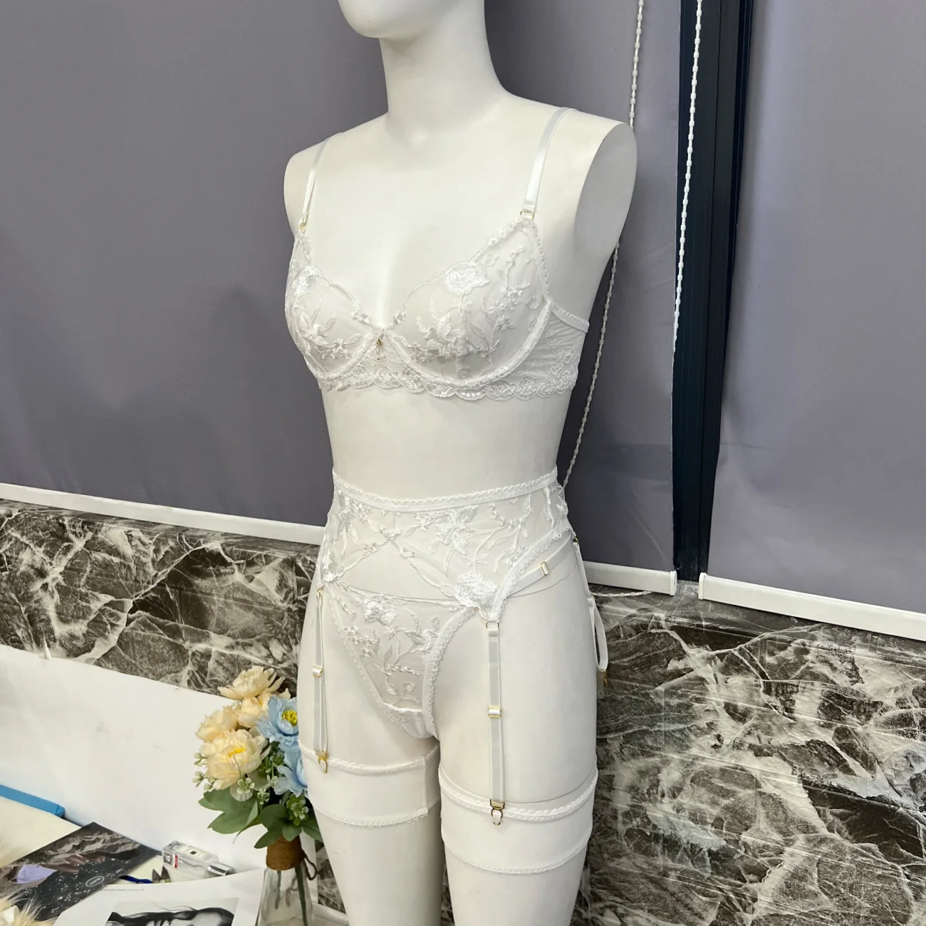 Sensual Lingerie Erotic Transparent Bra Ultra Sexy 5-Piece Crotchless Thongs Attractive Chest Suspenders Underwear 1555