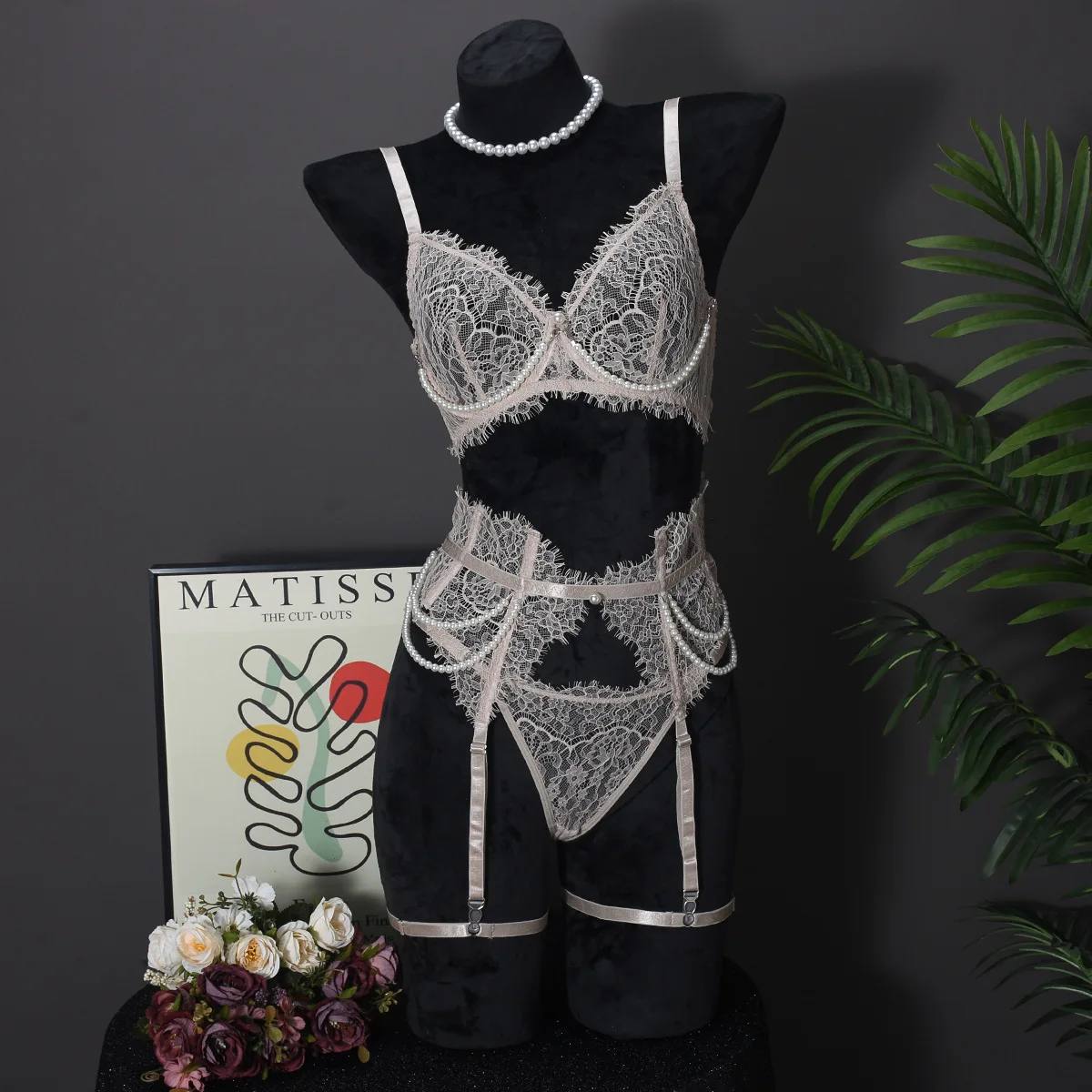 Lace Eyelash Sexy Lingerie Panty Garters Patchwork See-through Women Embroidery Premium Interesting Romantic Set 1561