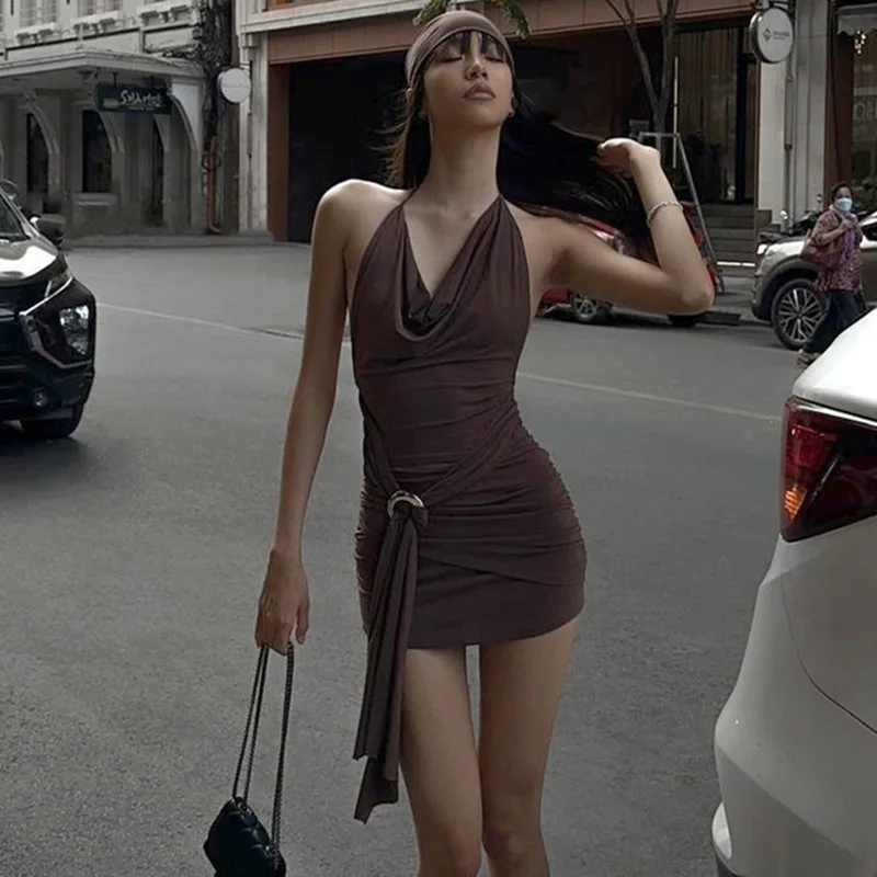 Harajuku Low-cut Backless Casual Mini Dress Vintage Ring Bandage Pleated Slim Dresses Party Fashion Street Vestidos 3151