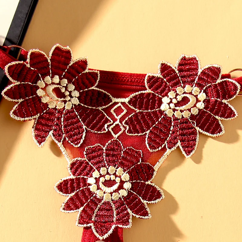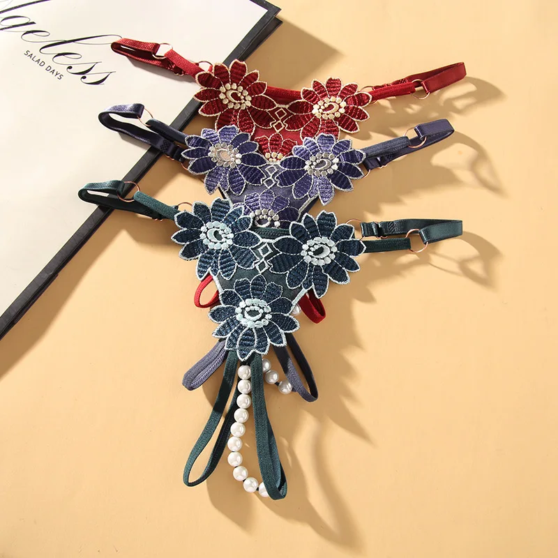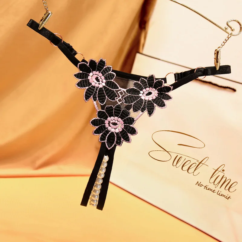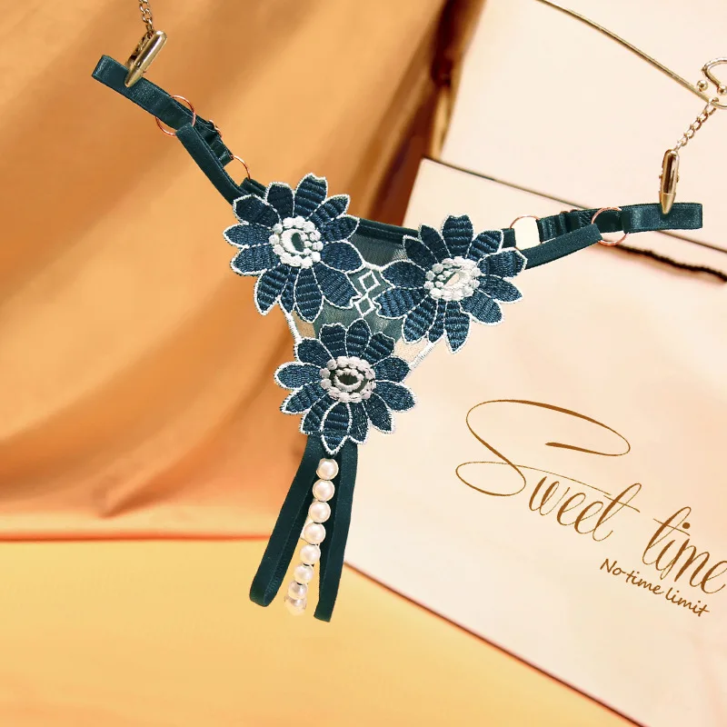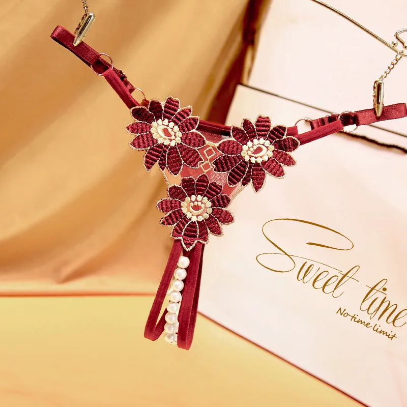 Pearl and Embroidery G-string Thong Lace Intimates Panties Underpants Mesh Yarn Mature Briefs Underwear Sexy Lingerie 0546