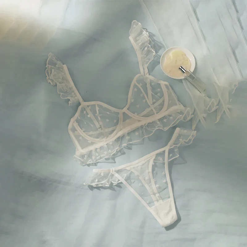 Wholesale Sexy Underwear with Heart Flocked Pattern Ruffled Frill Straps Women Lingerie for Lady Sexy Panties Sexy Underwear