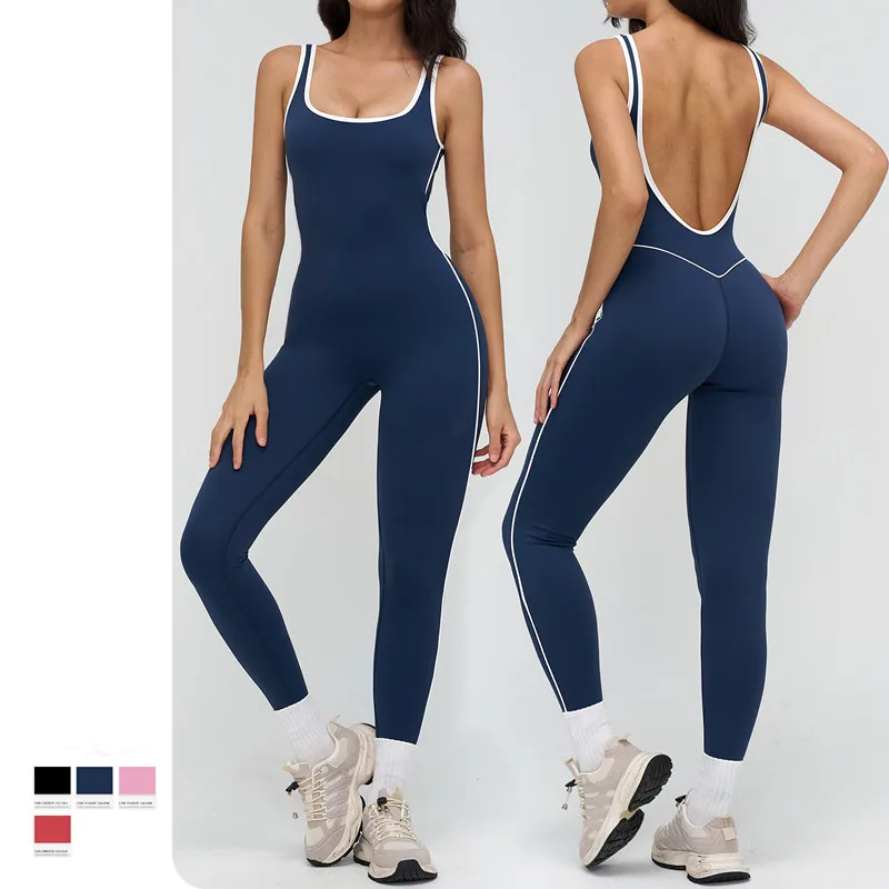 Cross-border Naked Yoga Jumpsuit Contrast Color-wrapped Seamless Full Length Generous Neckline Fitness Sports