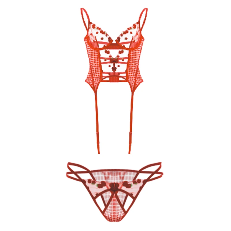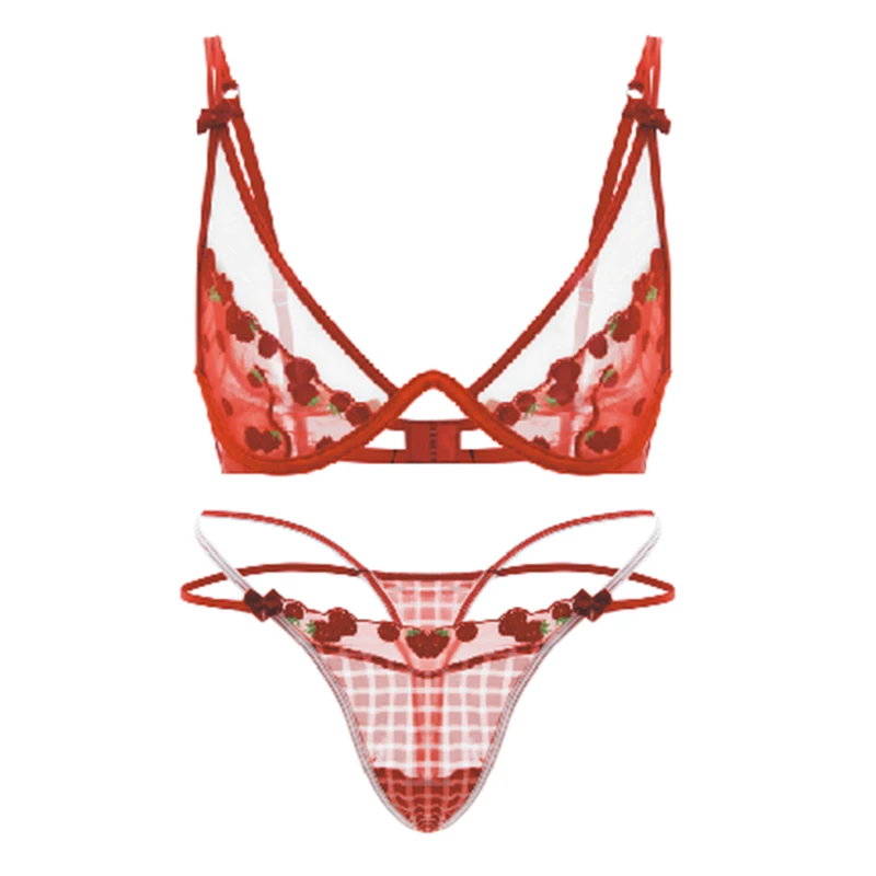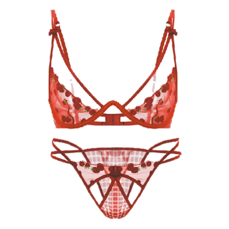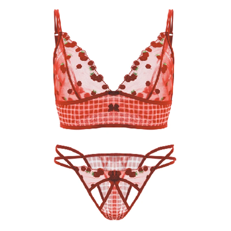 Retro Cherry V-Neck High-Rise Wire-Free Sexy Breathable Mesh Fabric Embroidery Plus Size Bra Set for Young Women