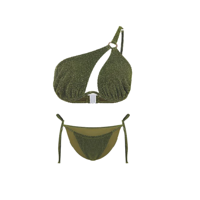 New Listing Fashion Lady Beachwear Shiny Lace High-Rise Two-Piece String Swimsuit Sexy One Shoulder Knitting Olive Bikini Sets