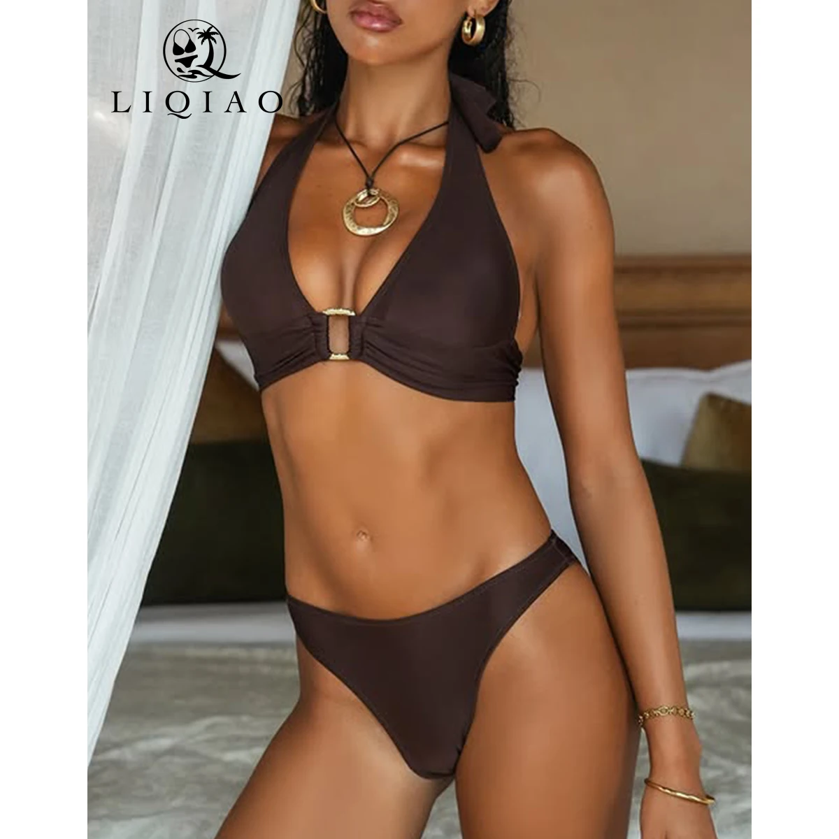 New Sexy Solid Color Backless Wide Shoulder Strap Two-piece Triangle Bikini Set Beach Swimsuit Custom Women's Swimsuit