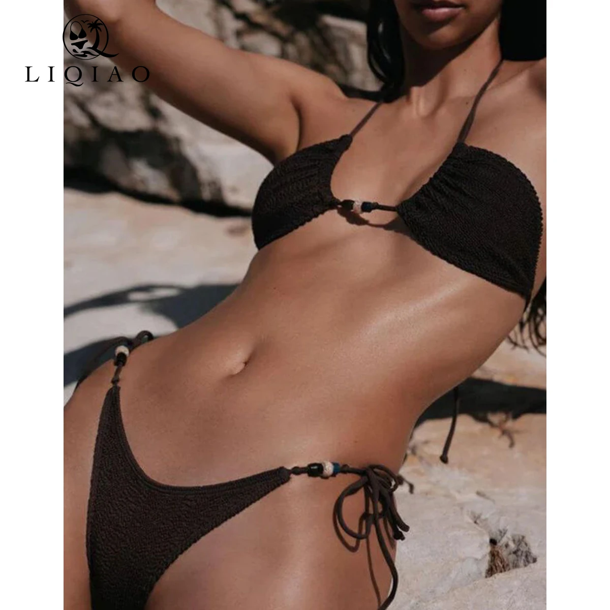 Textured Halter Bikini Set with Beaded Details Women's Two-Piece Summer Swimwear