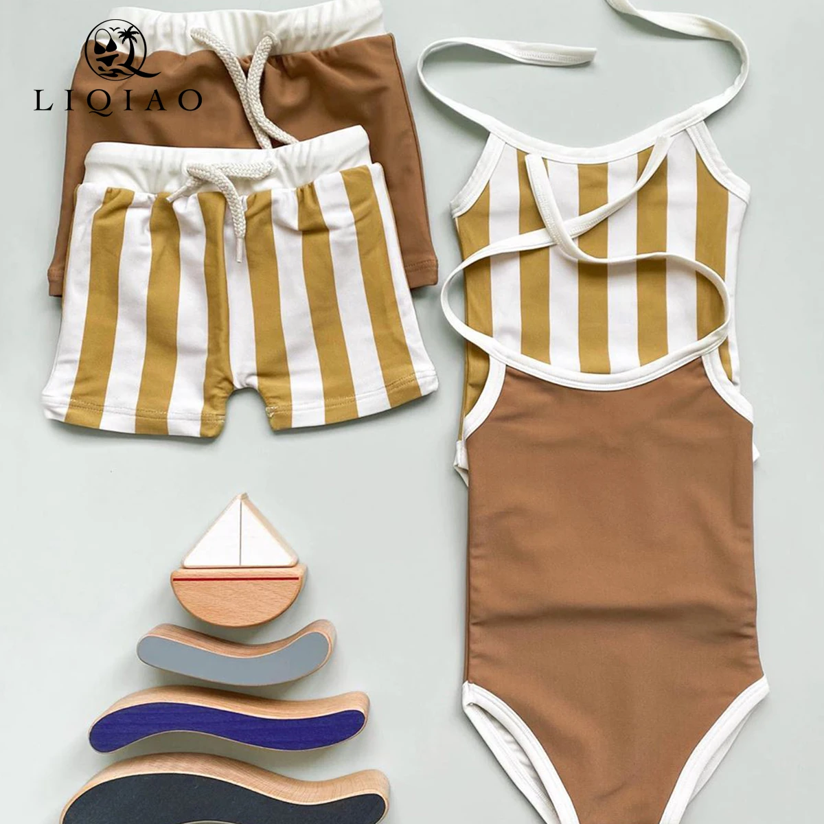 LIQIAO Custom Kids Swimwear Set Striped One-Piece Swimsuit & Shorts Children Bathing Suit OEM Low MOQ