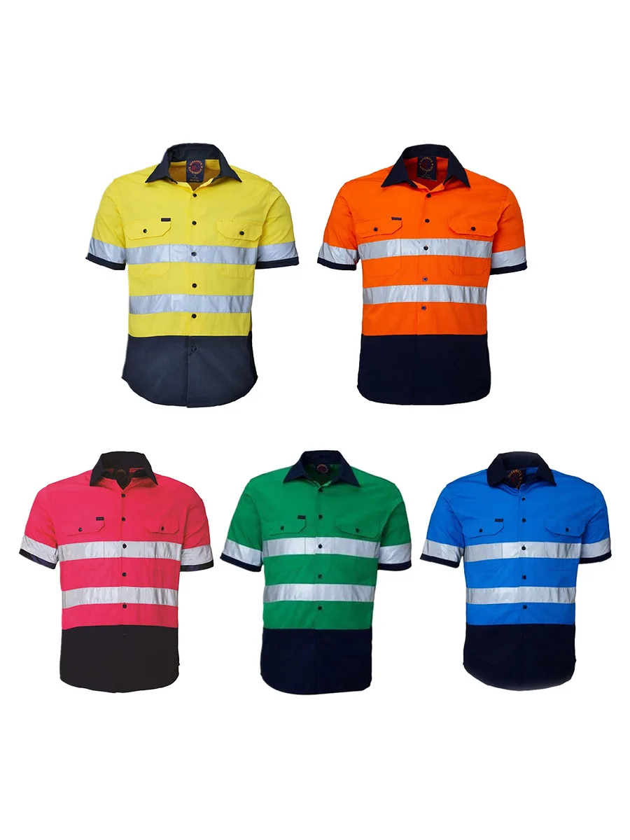 Short Sleeve Safety Work Shirt Reflective Workwear 100% Cotton Yellow Navy Safety Shirts With Hi Vis Tapes