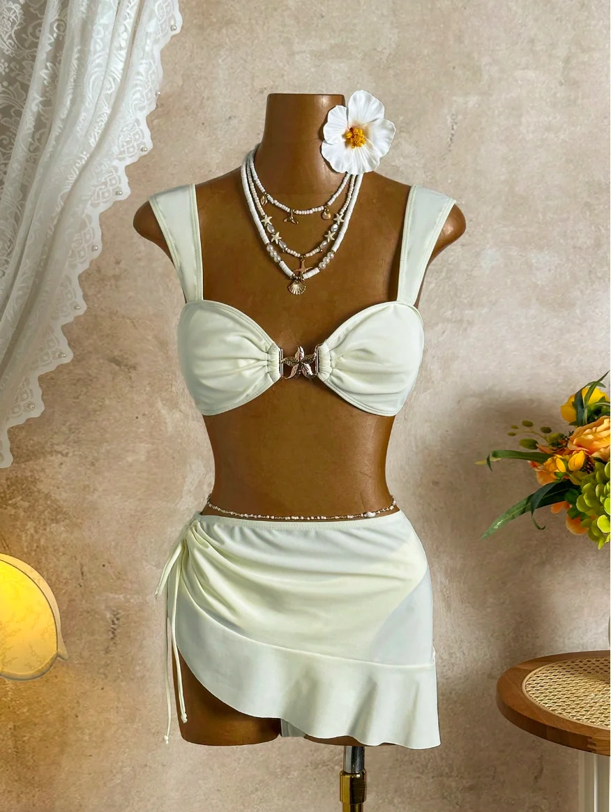 Women's Summer Sexy Slimming Bandeau Bikini Swimsuit Solid Shoulder Strap Tied Split 3-Piece Set with Logo on Waist