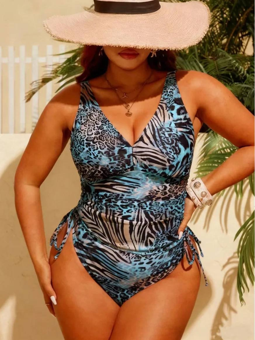 Plus Size Women's Leopard Print Halter Lace-Up 2-Piece Breathable Stretch Fabric Swimsuit Set for Summer Beach