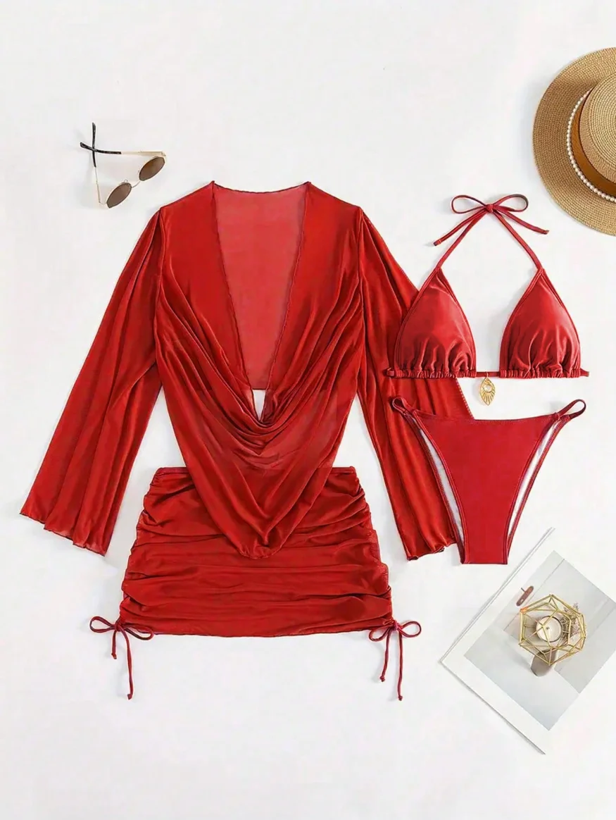 Sexy Woman's Long-Sleeved Beach Cover-Up with Logo on Waist Solid Color and Mesh Decoration for Bikini