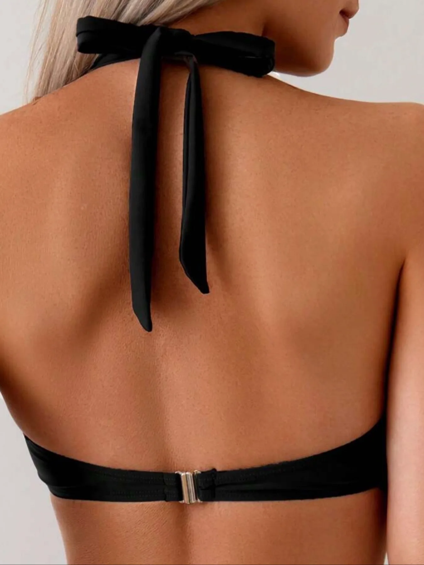 Women's Black Triangle Halter Bathing Suit Beach Skirt 3-Piece Quick Dry Bikini Set with Solid Pattern Sexy Cheeky Bottom