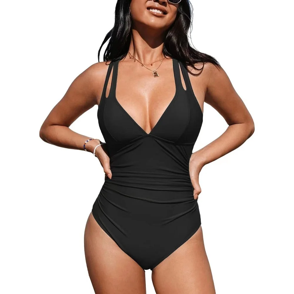 European and American New Deep V One-piece Swimsuits Cover the Belly and Show Thin Solid Color Women's Swimsuits