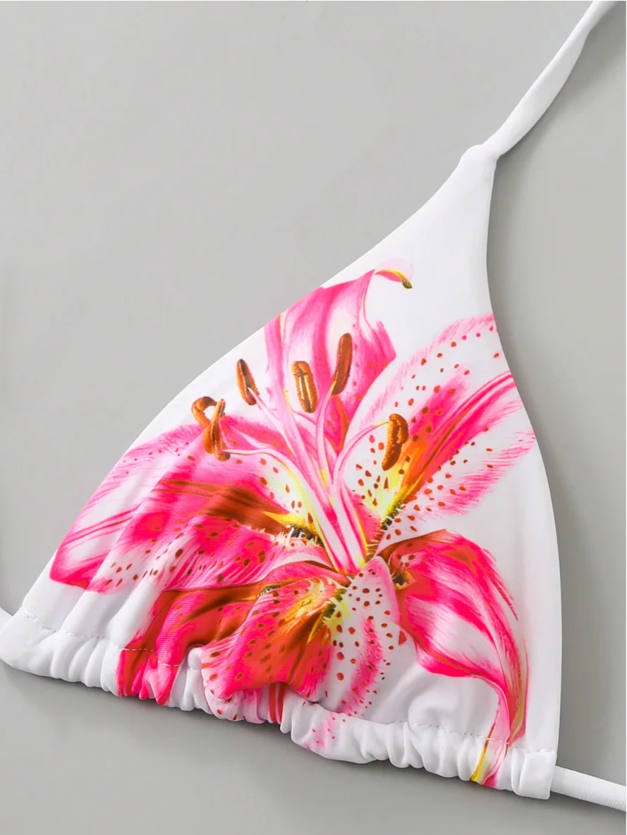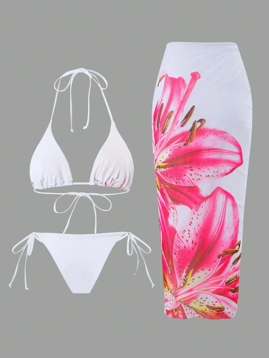 Custom Sexy Floral Print Bikini High Waist Triangle Halter Sarong Women's Thong Swimwear Cover up with Front Logo 3-Piece Set