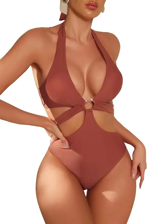 Women's Fashion One-Piece Swimsuit Deep V-Neck with Push-Up Bra High Cut Bottom Solid Pattern Belt Decoration Sexy Beachwear