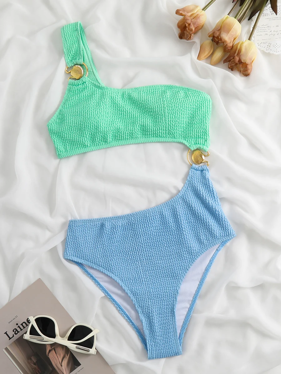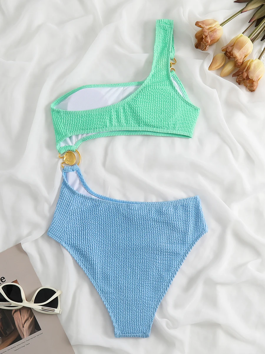 2023 OEM Shell Jewelry One Shoulder Swimsuit Women Sexy One Piece Swimwear Beachwear Female Padded Bathing Suit