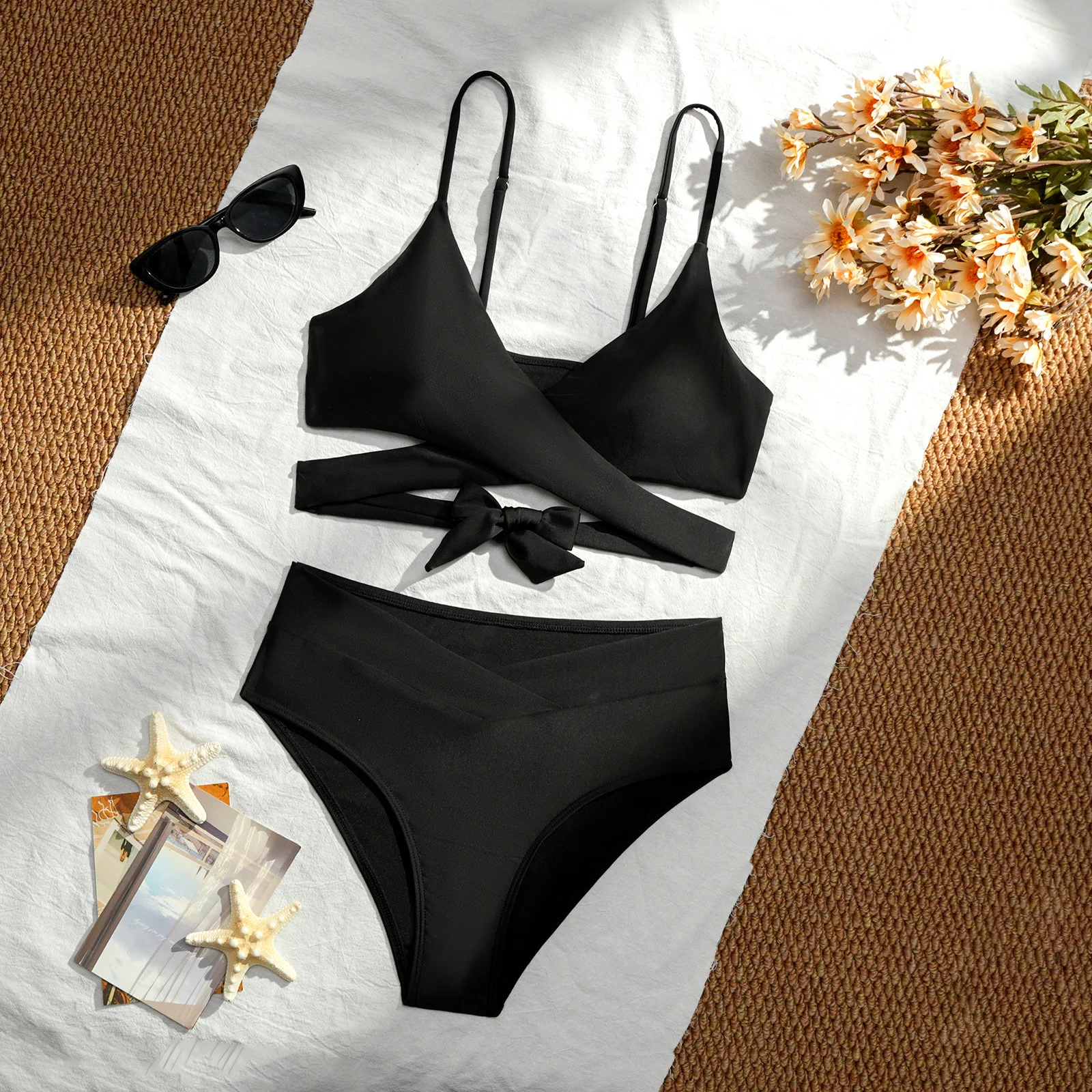 JSN 2026 Customized Solid New Fashionable Sexy Cross-Strap Women's Two Piece Set Hollow Out v Neck Bikini Low Waist Swimwear