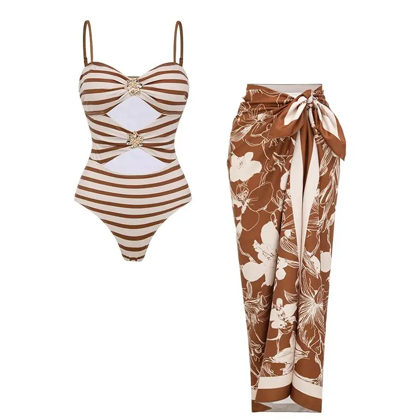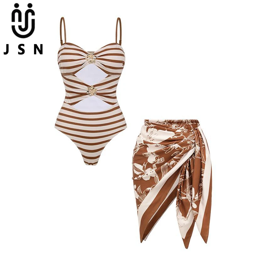 JSN 2026 New Design Customized Stripes Print Swimsuit Hollow Out Women's Fashionable Two Piece Bikini Set with Print Swimdress