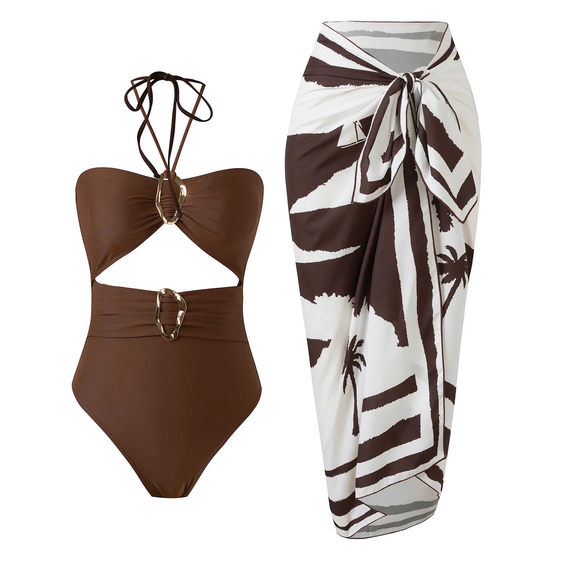 JSN 2026 New Design Halter Hollow Out Solid One Piece Bikini with Print Swimdress Women's Fashionable Swimsuit Sexy Beachwear