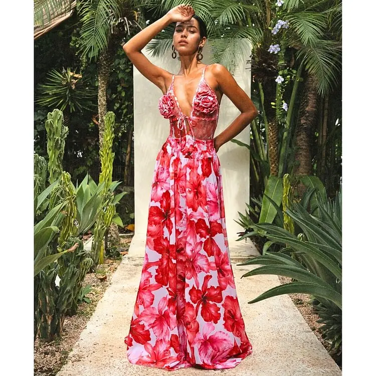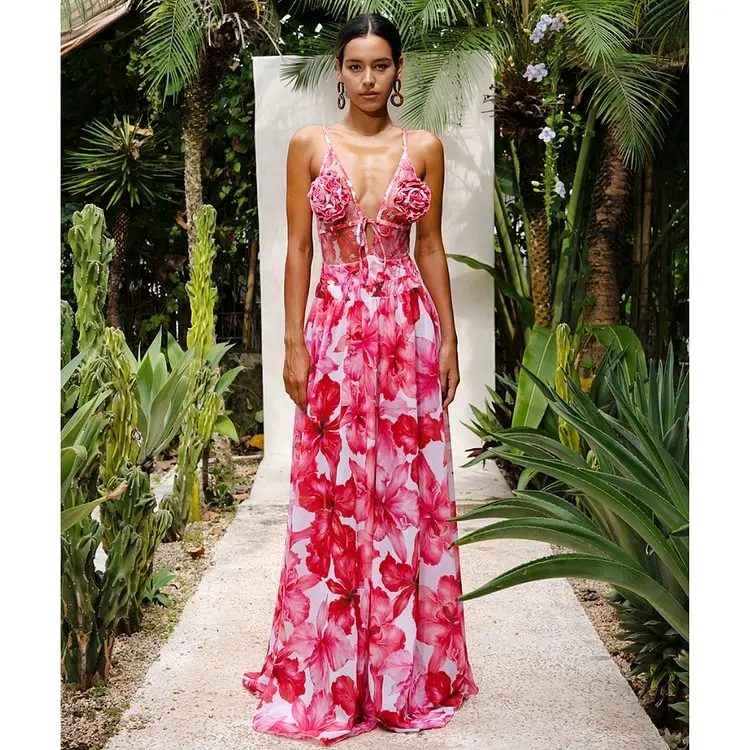 JSN Swimwear Manufacturer Customized Deep V 3D Flower Decor Mesh Splicing Printed One Piece Swimsuit and Skirt
