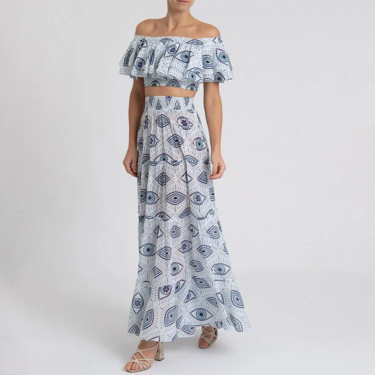 JSN New One-shoulder Bow Swimsuit Evil Eyes Women Beach Vacation Suit Skirt Swimswaer High Waist Bikini Beachwear Cover up