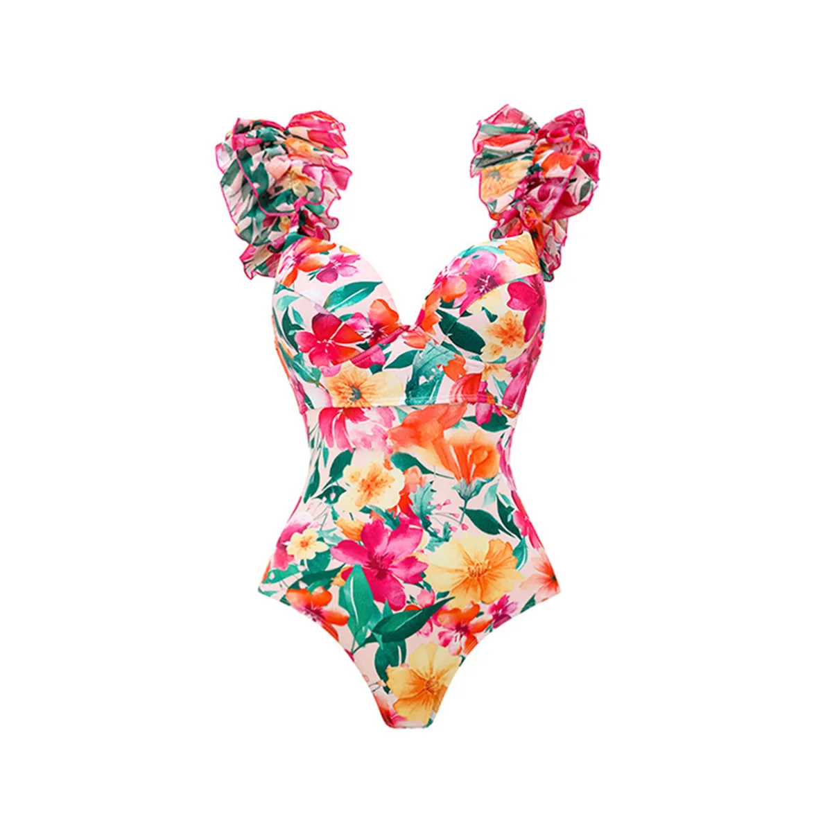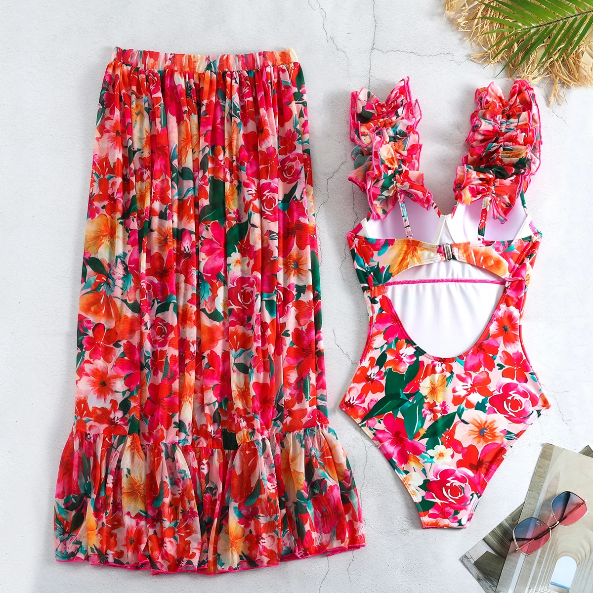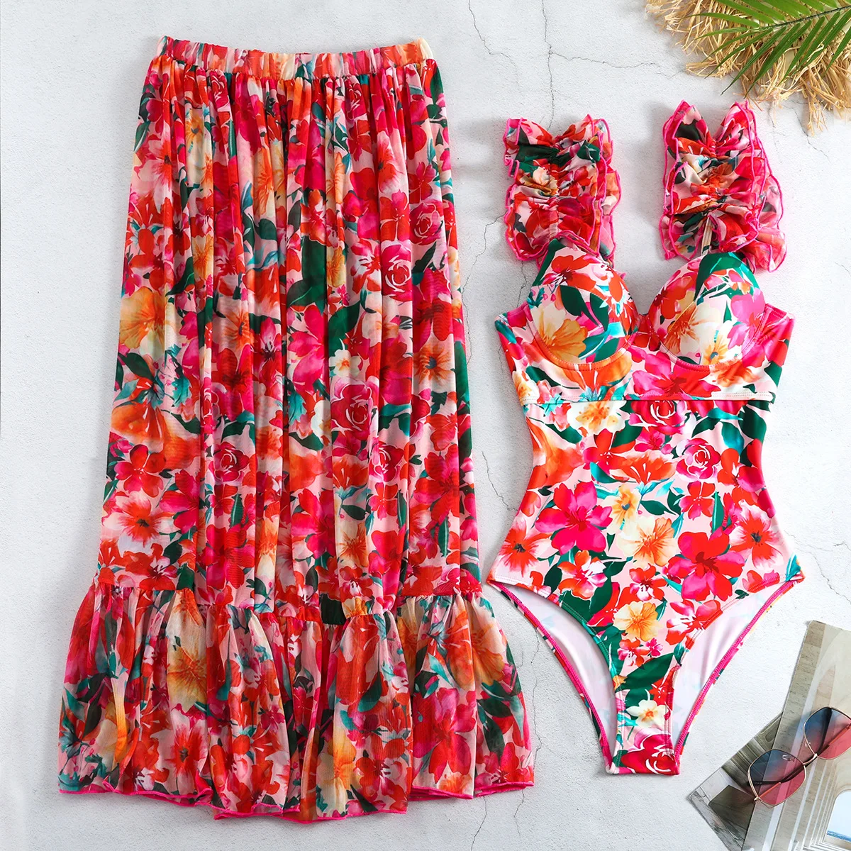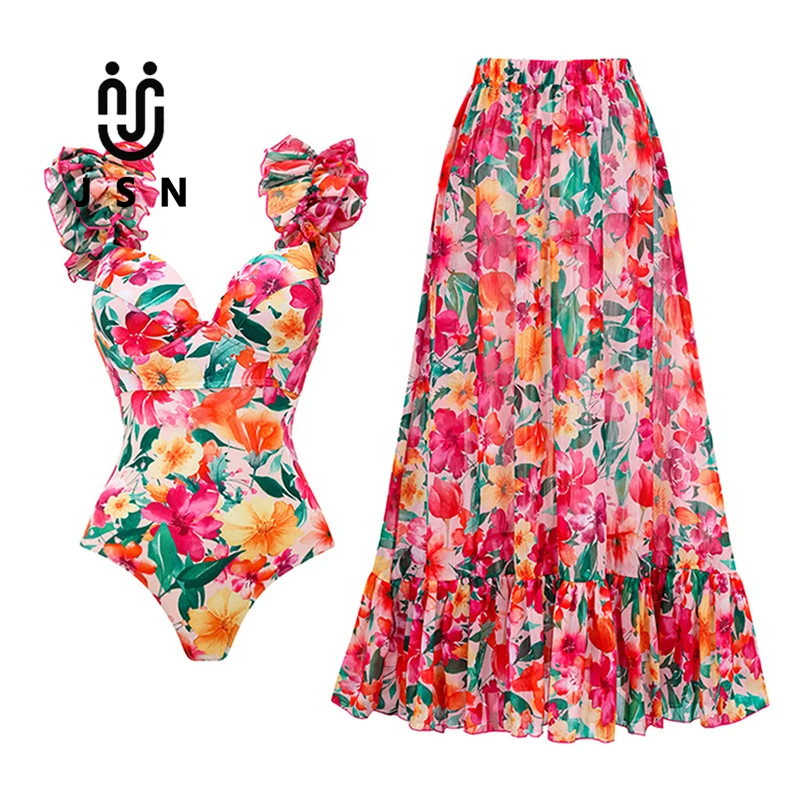 JSN Monokini Print Mesh Bathing Suits Swim Suit 2026 Sexy V Neck One Piece Swimsuit Women Ruffle Swimwear With Skirt
